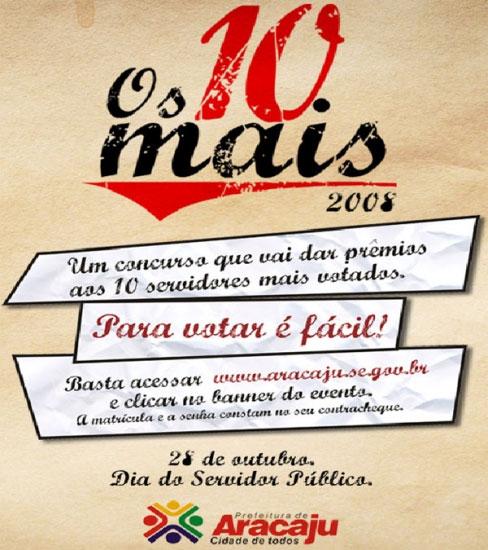 A expectativa é grande em torno da eleição dos ‘Dez Mais Servidores', que se encerra na próxima quinta-feira, dia 23. O concurso foi lançado no último dia 14 como parte das comemorações do Dia do Servidor para premiar os profissionais da administração municipal reconhecidos pelos colegas como sendo responsáveis, éticos, comprometidos, diligentes, solidários eficientes, comprometidos, carismáticos, inovadores, comunicativos, assíduos e pontuais (veja regulamento no banner no Portal da Prefeitura).
