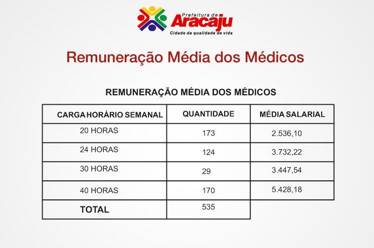 Na capital sergipana os médicos que atuam 20 horas por semana (são 173) recebem um salário médio de R$ 2.536,10. Já para os que têm carga horária de 40 horas (170), o valor médio é de R$ 5.428,18. Há ainda profissionais com carga horária de 24 e 30 horas, com salários de R$ 3.732,22 e R$ 3.447,54, respectivamente. "O profissional que trabalha 24 horas dá dois plantões de 12horas por semana, por isso tem uma remuneração maior", explica Jeferson. Ao todo, 535 médicos compõem a rede municipal.