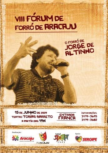 Discutir e destacar a trajetória de nomes consagrados da música nordestina e disseminar o autêntico forró. Esses são os objetivos do Fórum do Forró, que na 8ª edição do evento homenageia o cantor e compositor Jorge de Altinho. O evento acontece nesta segunda-feira, 15, a partir das 19 horas, no teatro Tobias Barreto, e será transmitido ao vivo através do site http://www.alfamatv.com.br/funcaju/forumdeforro2009/. Outra alternativa é acessar o hotsite especial do Forró Caju 2009 e clicar no banner do Fórum do Forró.