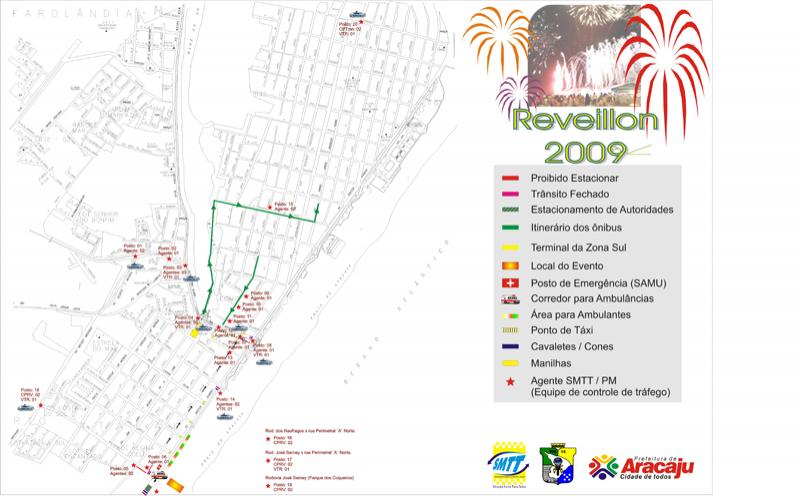 A partir das 22h do dia 31 de dezembro, a Prefeitura Municipal de Aracaju (PMA) irá realizar o Réveillon 2009, na terceira etapa da Orla de Atalaia. O evento contará com a apresentação de vários artistas e a tradicional queima de fogos. Diante disso, espera-se a concentração de milhares de pessoas, o que trará como consequência um acentuado fluxo de veículos demandando uma operação de trânsito e de transporte urbano especial.