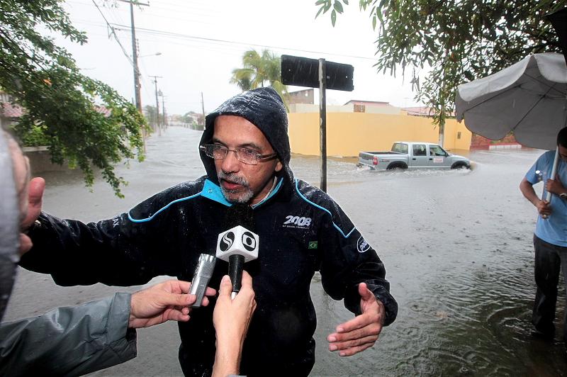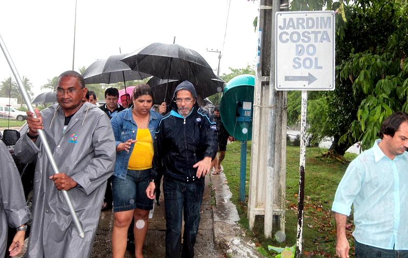 Sob muita chuva, o prefeito de Aracaju, Edvaldo Nogueira, determinou na manhã deste domingo, dia 11, soluções emergenciais para solucionar o alagamento que atinge o conjunto Costa do Sol, na zona sul da capital. Durante visita à localidade, ele informou aos moradores que será construída imediatamente uma valeta até o canal Heráclito Rollemberg, na avenida Beira Mar, para permitir o escoamento das águas que há horas inundam o residencial. Além disso, verificou o trabalho das equipes que desde o dia anterior estão drenando as ruas com bombas e carros-pipa.