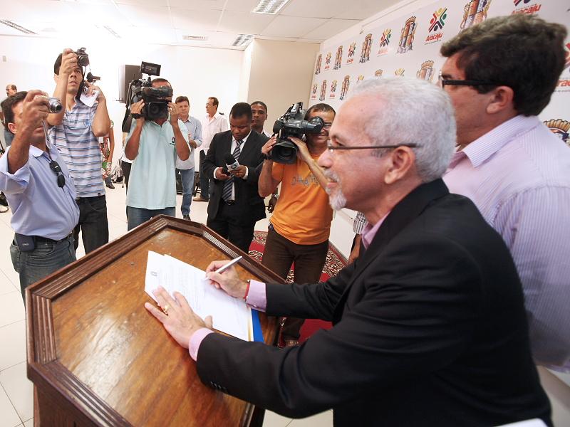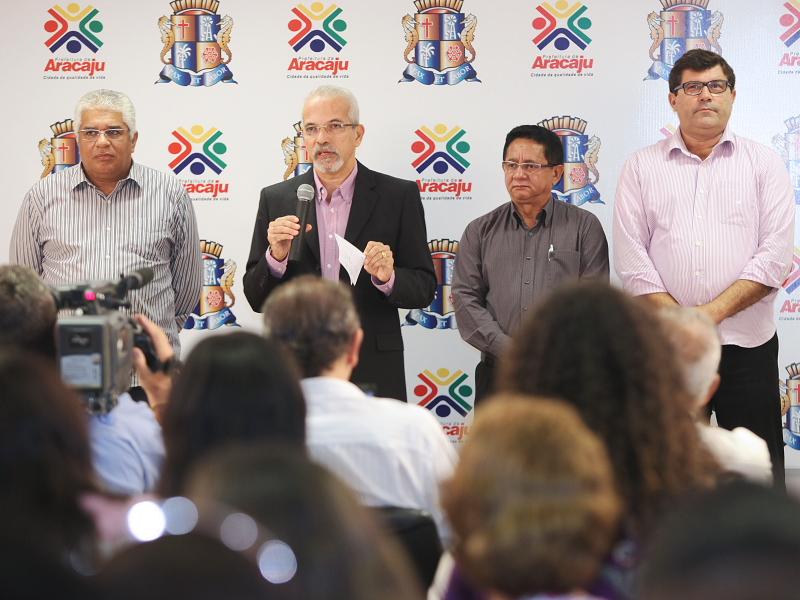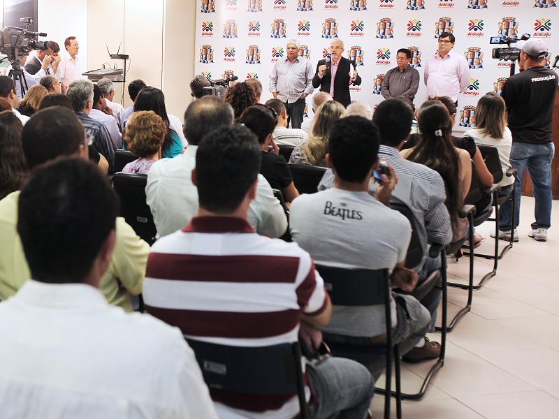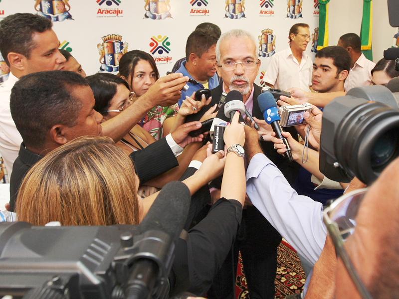 Na manhã desta sexta-feira, 18, o prefeito Edvaldo Nogueira reuniu a imprensa para divulgar o posicionamento da Prefeitura Municipal de Aracaju (PMA) sobre a licitação e os contratos firmados com as empresas responsáveis pela fiscalização eletrônica do trânsito na cidade. A coletiva aconteceu no auditório do Centro Administrativo Prefeito Aloísio Campos. Considerando que as empresas são acusadas de fraude em outros estados, o prefeito assinou um decreto determinando a suspensão temporária dos contratos, mesmo não havendo denúncias envolvendo o município de Aracaju.