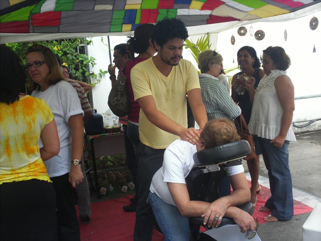 Na manhã de hoje, ao chegar ao trabalho os servidores da Saúde tiveram uma bela surpresa: a tenda florida e repleta de mudas e objetos artísticos montados pelo Nuprin. Até a secretária-adjunta, Eurides Rosa de Carvalho experimentou uma sessão de massagem. “Começar o dia de maneira harmônica, confraternizando com os amigos e colegas de trabalho é excelente”, elogiou.