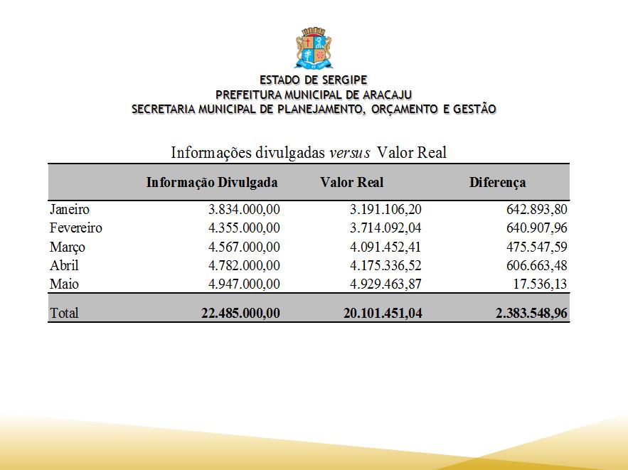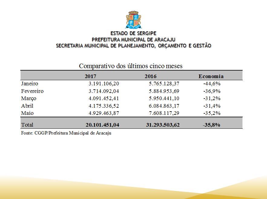 No total, nos cinco primeiros meses de 2016, foram gastos R$ 31.293.503,62, enquanto no mesmo período de 2017, o valor foi de 20.101.451,04, representando uma economia de 36%.