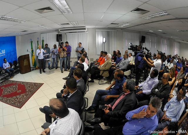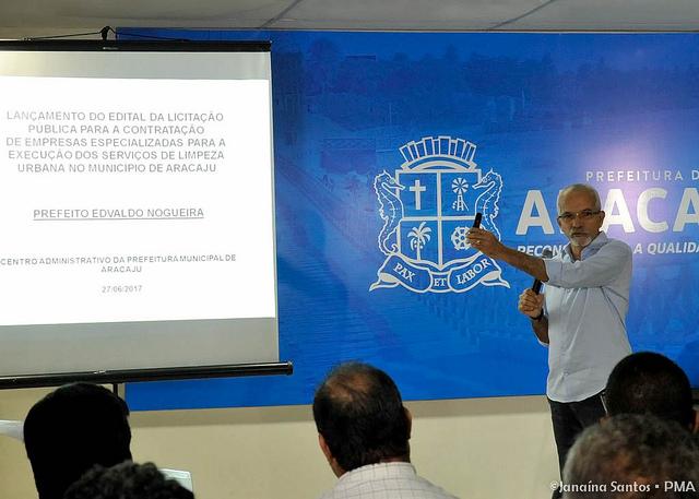 O prefeito Edvaldo Nogueira lançou, na manhã desta terça-feira, 27, o edital de licitação pública para a contratação de empresas especializadas para a execução dos serviços de limpeza urbana em Aracaju. Em solenidade realizada na sede da prefeitura, o gestor municipal explanou que a licitação será dividida em quatro lotes, que envolvem a coleta, transporte e descarga de resíduos sólidos urbanos, dos resíduos da construção civil, varrição de logradouros públicos e de praias, além de ações de educação ambiental. O edital prevê a contratação das empresas para um prazo de cinco anos, com valor anual dos serviços de R$ 80 milhões.
