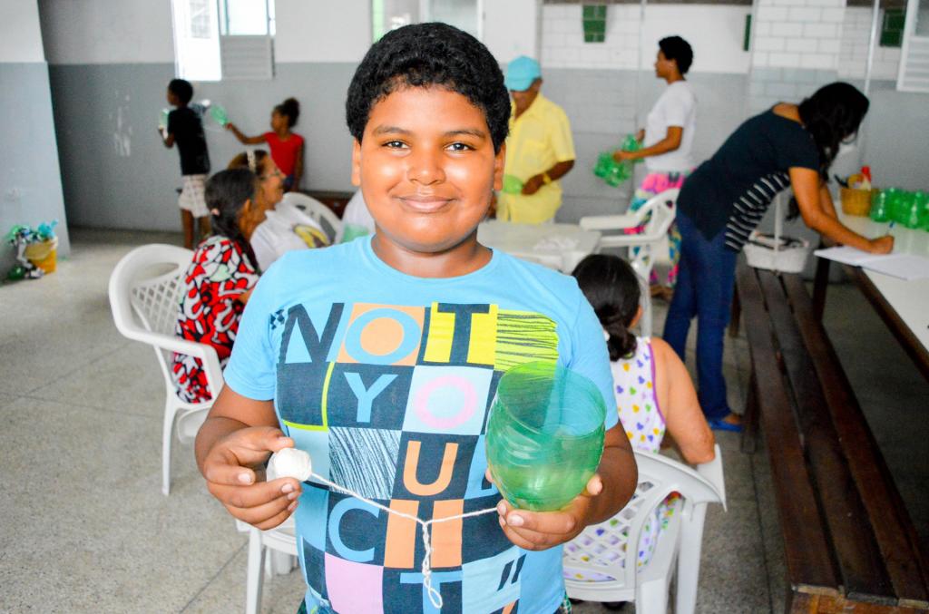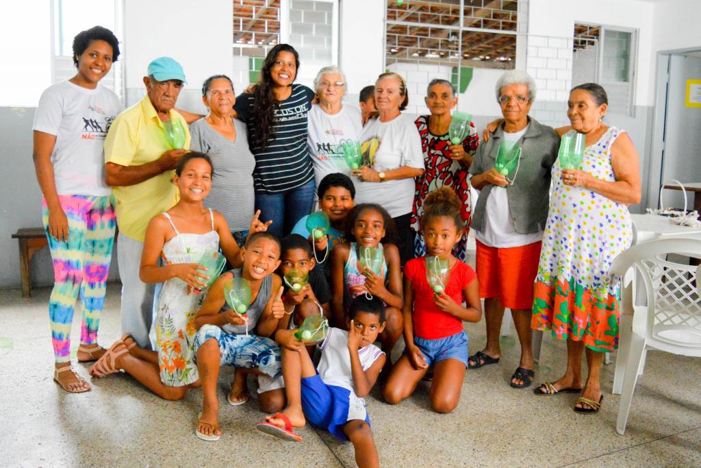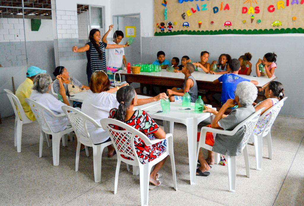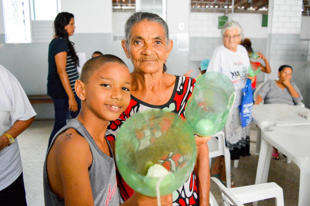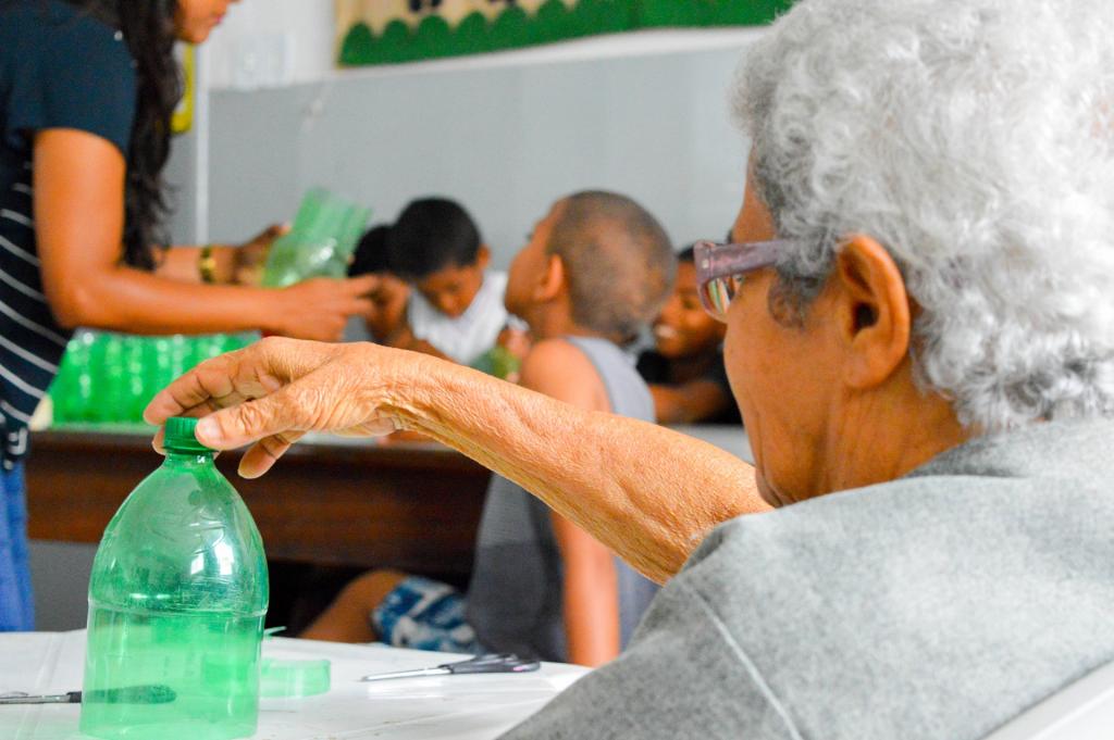 Materiais reciclados a postos, tesoura sem ponta, fita crepe, um pouco de barbante e duas ideias de brinquedos executadas a várias mãos: vai-e-vem e bilboquê. De acordo com a educadora social, Brunna Morais, é somente através dessa aproximação a convivência será estimulada pois há uma diferença muito do próprio tempo que os idosos viveram quando pequenos e as crianças vivem agora. Inicialmente sempre há uma bagunça, porque os mais velhos têm resistência com as crianças porque há um estigma de que elas não obedecem. mas no decorrer da oficina, você percebe que eles se integram e contribuem uns com os outros”.