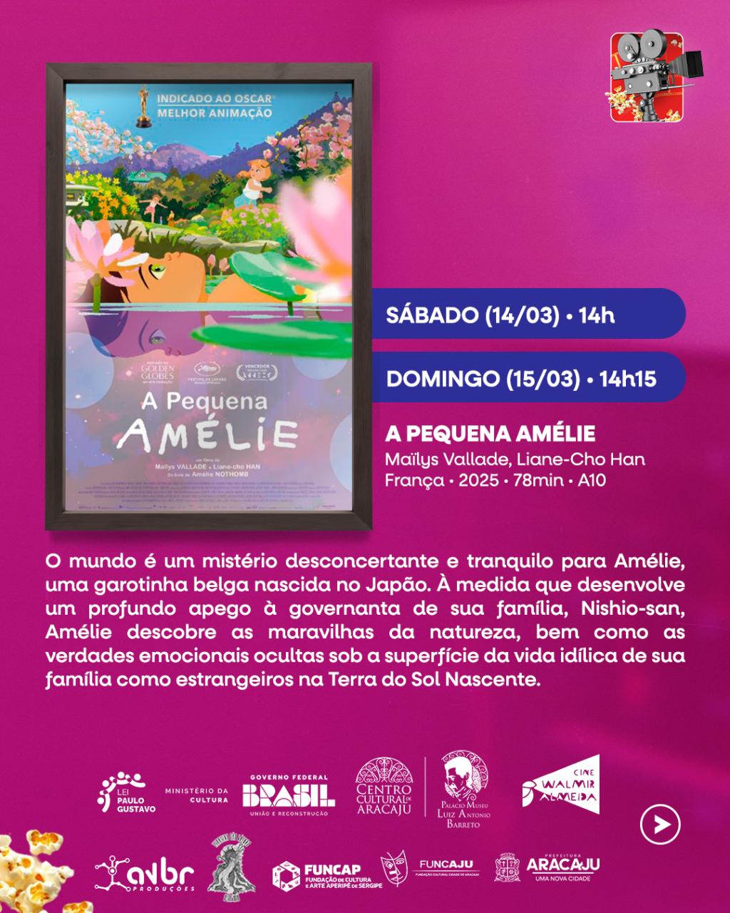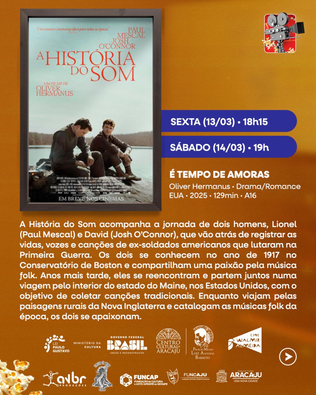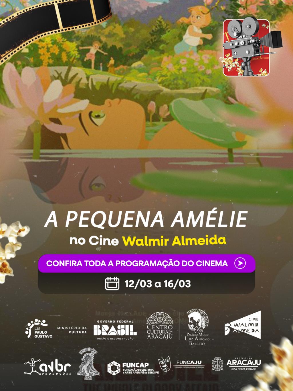 O Cine Walmir Almeida, localizado no Centro Cultural Palácio-Museu Luiz Antônio Barreto — unidade da Fundação Cultural Cidade de Aracaju (Funcaju) — apresenta na programação desta semana filmes inéditos, como o longa A História do Som e a animação A Pequena Amélie. A grade também conta com a reexibição de títulos premiados, entre eles O Agente Secreto e Hamnet.