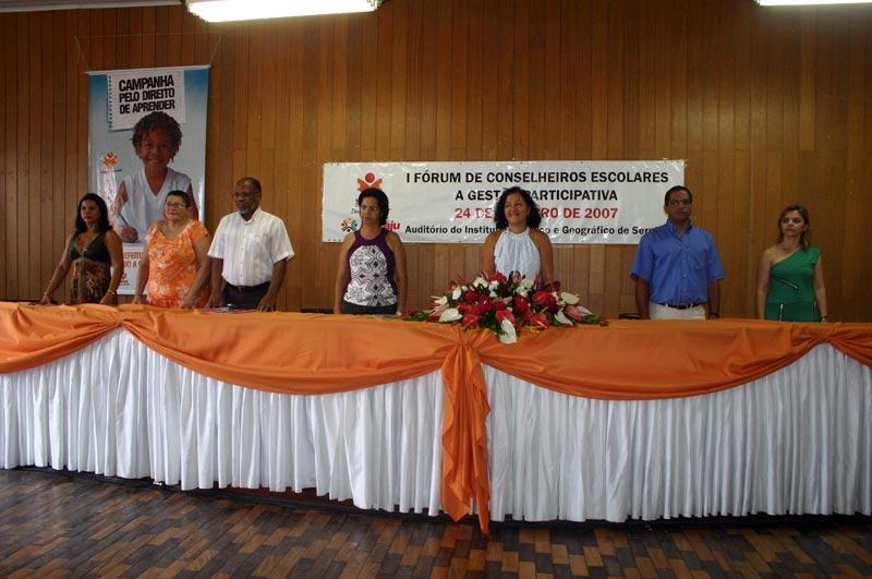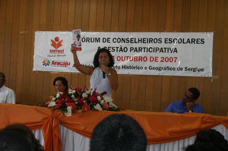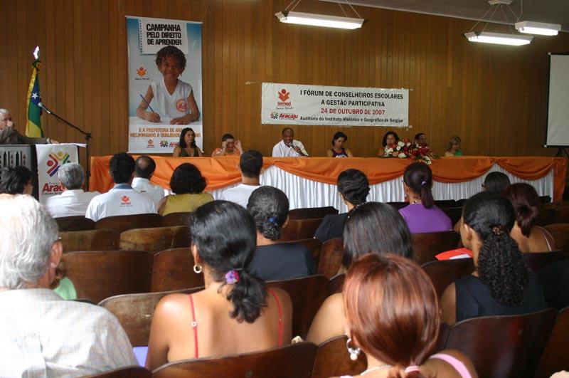 Representantes de todos os segmentos dos conselhos escolares da rede municipal da educação estiveram reunidos durante toda a manhã de hoje no Instituto Histórico e Geográfico de Sergipe, localizado na rua Itabaianinha, Centro da capital, para participar do I Fórum de Conselheiros Escolares. O objetivo do evento foi discutir o papel dos conselhos no acompanhamento das questões administrativas, pedagógicas e financeiras das instituições de ensino. Antes da abertura, que foi realizada pela secretária municipal da Educação, a professora Tereza Cristina Cerqueira da Graça, foi feita uma apresentação cultural de Valtinho do Acordeon, que também executou o hino nacional. Estiveram presentes, além dos conselheiros, a representante da Secretaria Estadual da Educação, Jucileide Dias; o presidente do Sepuma, Nivaldo Fernando; a diretora de ensino da Semed, Niraíldes Prado; o vice-presidente do Conselho Municipal da Educação, Neilton Diniz Silva; a coordenadora de Gestão Escolar da Semed, Maria José Guimarães e a representante dos movimentos populares e a integrante do Comitê Municipal Todos pela Educação, Isabel Canjirana. O Fórum é a quinta ação da Campanha Pelo Direito de Aprender, lançada pela Semed em agosto desse ano. Dentro dessa ação está o fortalecimento dos Conselhos Escolares, que busca uma oportunidade para oferecer um espaço de discussão sobre a gestão democrática, com vista a um maior envolvimento desses conselheiros. A nossa expectativa é que os participantes aproveitem este momento, compreendendo a sua função e socializando experiências. Espero também que retornem à escola e realizem um acompanhamento ainda maior das ações que são desenvolvidas na sua unidade de ensino, disse Maria José Guimarães. A palestrante desta manhã, que falou sobre a Gestão Participativa, foi a professora do departamento de Ciências Sociais da Universidade Federal de Sergipe e pesquisadora do Instituto de Tecnologia e Pesquisa, Verônica Teixeira Marques. Ela apresentou uma discussão sobre a democracia e a participação elaborada por pensadores. No segundo momento a pesquisadora buscou uma discussão sobre os desafios que a escola pública enfrenta para implantar a participação da sociedade na sua gestão. Quis provocar algumas reflexões sobre o papel dos pais e dos alunos para desmistificar a concepção da escola pública de qualidade que existiu no passado. Antigamente o público dessa escola era a classe média e esta exercia um papel fundamental de cobrança pela qualidade. É necessário que esse novo público, que freqüenta a escola, exerça a mesma função, e os membros do conselho podem fazer isso, afirmou a palestrante. Ressaltando o valor da iniciativa, a secretária municipal da Educação elogiou o Fórum e agradeceu a presença de todos, e pediu o apoio dos conselheiros na luta pela melhoria da qualidade de ensino oferecido na rede. A educação brasileira sente a necessidade de redefinir as diretrizes utilizadas até agora. Dados mostram que os melhores índices educacionais ocorrem justamente em cidades nas quais a atuação do conselho é efetiva, mostrando como esse instrumento é importantíssimo, lembrou Tereza Cristina. A conselheira Maria Clara Hora de Lima, da Escola Municipal de Educação Infantil Jovino Pinto, situada no Bairro Aeroporto, lembrou de como o Conselho Escolar é importante para o bom funcionamento da escola na qual trabalha. Pude perceber que os pais e os alunos estão mais conscientes e que são essenciais nesse processo de gestão democrática. Espero que os participantes desse fórum aproveitem para aprender mais e adquirir conhecimentos. A iniciativa também foi elogiada pelo presidente do Sepuma, Nivaldo Fernando, ao declarar que a iniciativa da Semed, em fortalecer cada vez mais a gestão democrática e a participação de todos os segmentos nas decisões da unidade escolar é algo que agrada muito o sindicato. Amanhã, dia 25, a partir das 18 horas, acontece o Fórum dos Professores no Centro Municipal de Aperfeiçoamento de Recursos Humanos Professor Fernando Lins de Carvalho. No dia nove de novembro é a vez do segmento dos servidores administrativos, que será realizado na Emei Garcez Vieira, Bairro Siqueira Campos. O Fórum dos pais e alunos acontece no dia 10 a partir das 14 horas, também Emei Garcez Vieira.