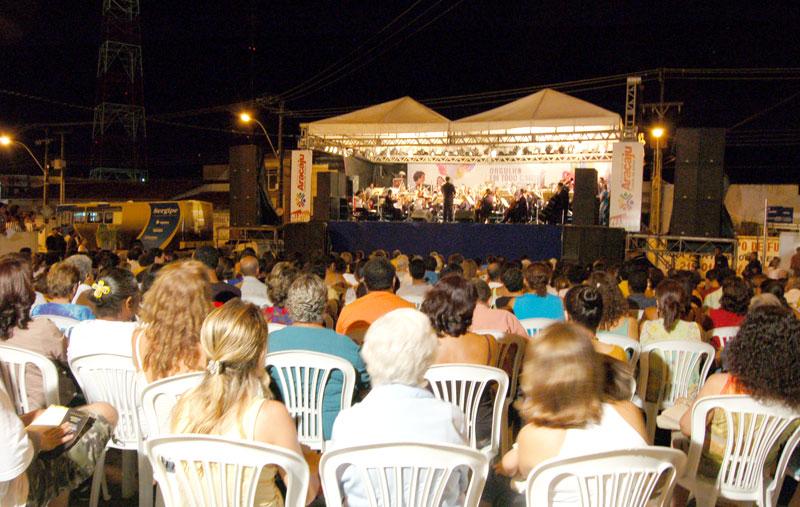 O Canta Colina, emocionou o público que prestigiou na noite desta sexta-feira, dia 16, véspera do aniversário de 152 anos Aracaju, a apresentação da Orquestra Sinfônica de Sergipe, do Coral Canarinhos de Aracaju e da Camerata de Violões Heitor Villa-Lobos. Promovido pela Prefeitura de Aracaju, por meio da Fundação Municipal de Cultura, Turismo e Esporte (Funcaju), o evento marcou a passagem do aniversário da cidade na colina do Santo Antônio, local que marca a história e o surgimento de Aracaju. Segundo a presidente da Funcaju, Lucimara Passos, o Canta Colina é um evento já consolidado na programação de aniversário da capital sergipana. Ela explicou que esse ano a proposta foi acessibilizar a música clássica e erudita para a população com a apresentação em praça pública. A colina é um local simbólico para a história da capital, portanto a população merecia uma homenagem de qualidade, disse Passos. Lucimara também ressaltou que, além dos 152 anos de Aracaju, está sendo comemorado na ocasião um ano de administração do prefeito Edvaldo Nogueira. Segundo a presidente, a marca desta gestão é fomentar a cultura na capital levando a arte para todos os cantos da cidade. Esperamos que a população entenda que a Prefeitura de Aracaju está colaborando para construir uma cidade de todos, comentou. Regida pelo maestro Guilherme Mannis, a Orquestra Sinfônica de Sergipe abriu as apresentações da noite. Para homenagear a cidade foram selecionadas peças consagradas como a ópera Suite Carmen, de Georges Bizet, a 5º Sinfonia de Ludwig Van Beethoven, além de peças regionais como a Rapsódia sobre o Meu Papagaio, do pianista e regente sergipano Daniel Freire. A Orquestra encerrou sua participação da noite com a música Feira de Mangaio de Sivuca, fazendo o público romper com a formalidade ao acompanhar com palmas a apresentação. O maestro Mannis demonstrou satisfação de participar do Canta Colina e elogiou a iniciativa da PMA que leva a música clássica para a população que não tem acesso. É um esforço muito grande trazer os músicos e os instrumentos para uma apresentação ao ar livre, mas é necessário incluir esse público que não vai ao teatro num projeto cultural, declarou o maestro. Na seqüência, o Coral Canarinhos de Aracaju subiu ao palco com 50 crianças e adolescentes, com idades entre 11 e 17 anos, regidas pelo irreverente maestro Carlos Magno. Os Canarinhos encantaram a platéia com canções regionais entre elas: Cheiro da Terra, do cantor e compositor Cláudio Miguel, do grupo Cata Luzes. Para encerrar a noite, a Camerata de Violões Heitor Villa-Lobos, de Santos, resgatou o saudosismo com um repertório eclético que incluiu diversas vertentes musicais, como a música espanhola, a latino-americana e o sertanejo. O Maestro Antônio Manzoine regia numa perfeita sintonia ao mesmo tempo com a platéia e os violonistas. Em sua primeira visita ao Nordeste, Manzoine demonstrou sua satisfação com a receptividade dos aracajuanos: Estou encantado com a beleza e organização da cidade e, principalmente com o carinho das pessoas, afirmou Manzione. Veja mais... Edvaldo Nogueira: Estamos todos felizes por termos Deus em nossa cidade