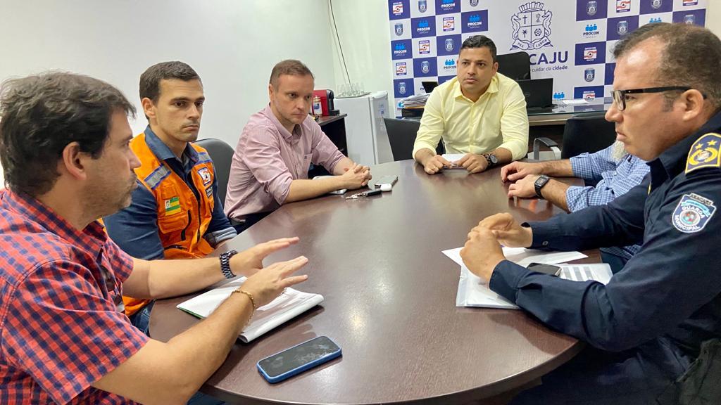 Na tarde desta quinta-feira, 4, representantes de órgãos municipais dialogaram sobre procedimentos relacionados à liberação de festejos juninos nos bairros da capital sergipana. A reunião ocorreu na sede da Secretaria Municipal da Defesa Social e da Cidadania (Semdec), com a participação da Empresa Municipal de Serviços Urbanos (Emsurb), Superintendência Municipal de Transporte e Trânsito (SMTT), Secretaria Municipal do Meio Ambiente (Sema), Guarda Municipal de Aracaju (GMA) e Defesa Civil de Aracaju.