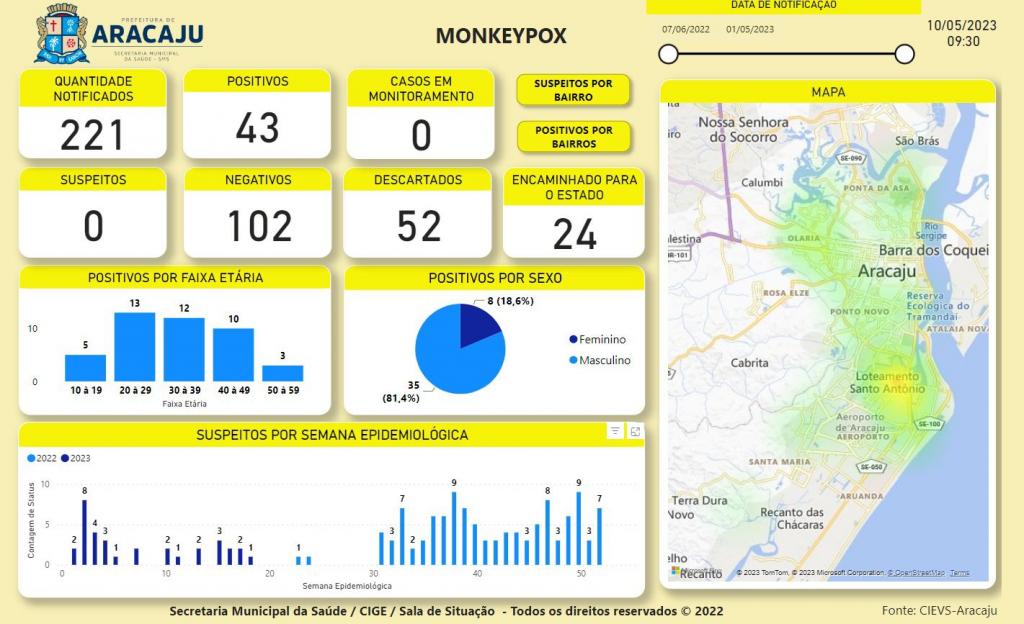 “O último caso positivo de monkeypox registrado em Aracaju foi no dia 14 de janeiro deste ano. O sistema é acessível à população, o que possibilita que todos tenham acesso a informações atualizadas e, consequentemente, tenham noção da real situação epidemiológica da cidade. O painel de monitoramento de monkeypox foi criado pela Sala de Situação, do setor de Inovação e Gestão Estratégica da SMS, e está disponível no site da Prefeitura”, explica o gerente da Sala de Situação da SMS, Maycon Santana.