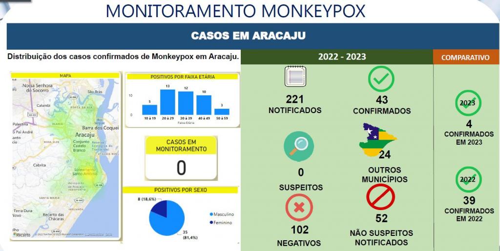 Na capital sergipana, a Prefeitura de Aracaju, por meio da Secretaria Municipal da Saúde (SMS), mantém o painel de monitoramento de monkeypox, ferramenta que auxilia na tomada de decisão da gestão pública. A partir desse painel, gestores realizam semanalmente o acompanhamento da doença na cidade, que há quase quatro meses não registra novos casos. Até o momento, somente quatro casos foram registrados em 2023.