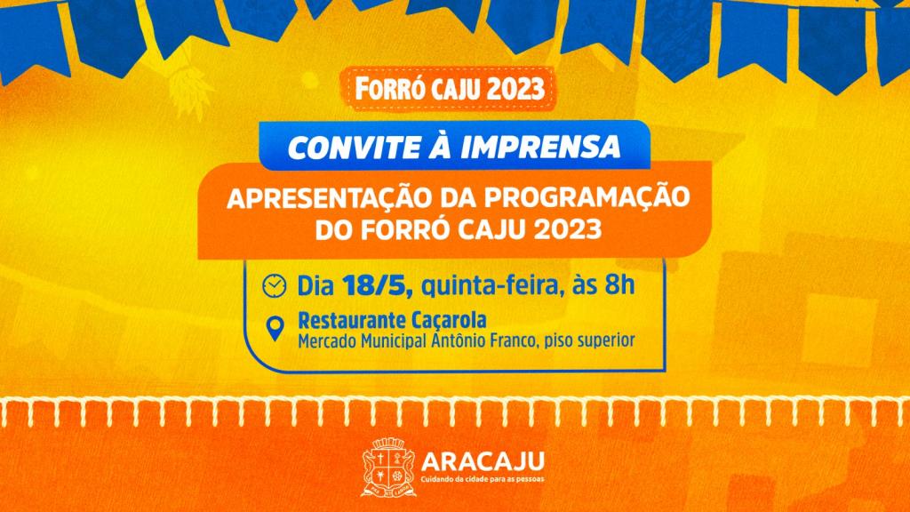 A Prefeitura de Aracaju convida a imprensa para acompanhar a apresentação da programação completa do Forró Caju 2023, que será realizada pelo prefeito Edvaldo Nogueira e pelo presidente da Fundação Cultural Cidade de Aracaju (Funcaju), Luciano Correia, nesta quinta-feira, dia 18, às 8h, no Restaurante Caçarola.