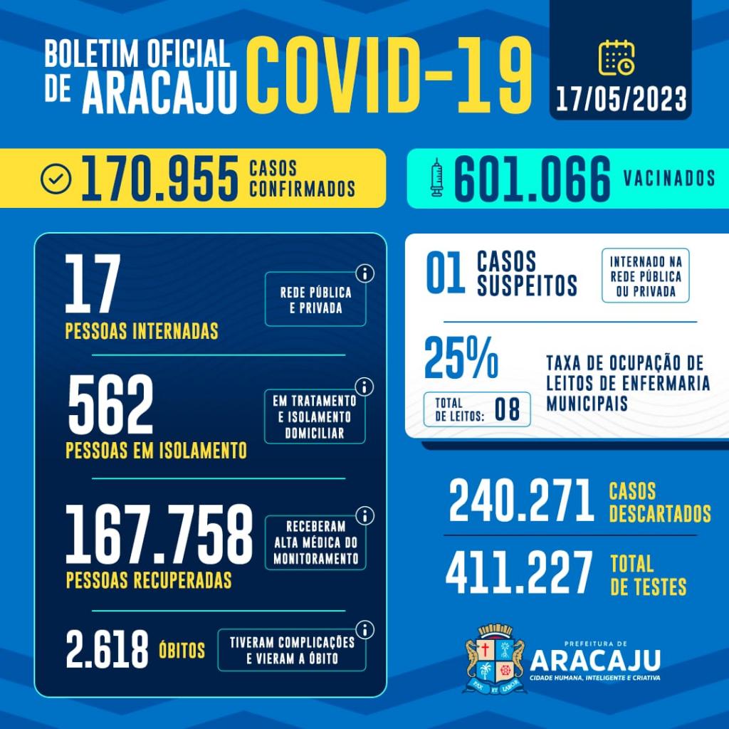 Com isso, 170.955 pessoas foram diagnosticadas com covid-19 em Aracaju. Destas, 17 estão internadas em hospital e 562 pacientes em isolamento domiciliar; 167.758 que estavam infectados já estão recuperados e 2.618 foram a óbito.