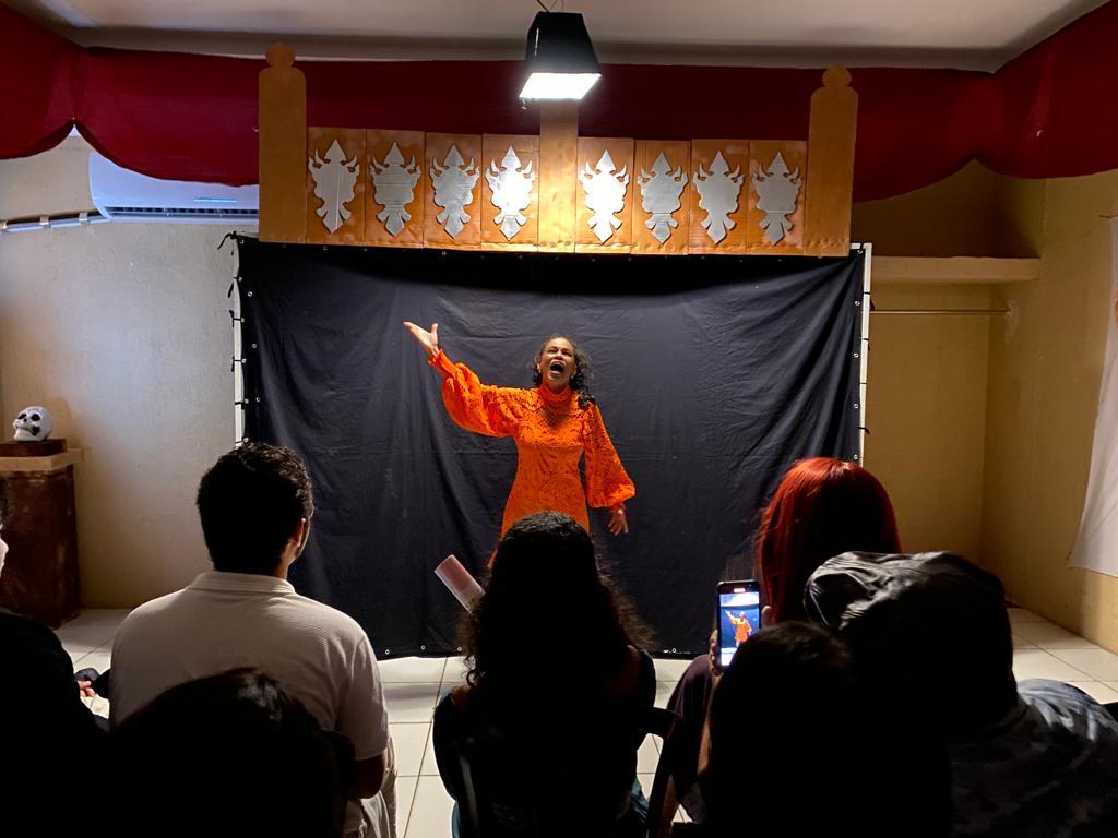 O encontro contou com a apresentação de dois alunos do curso técnico de teatro da escola, André Luis e Christy Monteiro, que apresentaram os monólogos de dois grandes personagens da dramaturgia, Hamlet e Medéia. Além de um diálogo quanto ao desenvolvimento dos personagens e o processo de formação do ator e da atriz.