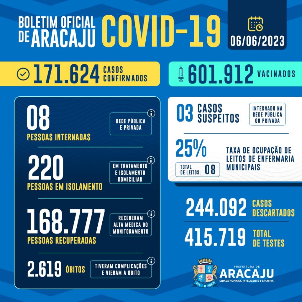 Com isso, 171.624 pessoas foram diagnosticadas com covid-19 em Aracaju. Destas, oito estão internadas em hospital e 220 pacientes em isolamento domiciliar; 168.777 que estavam infectados já estão recuperados e 2.619 foram a óbito.