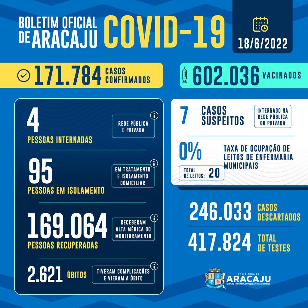 Com isso, 171.784 pessoas foram diagnosticadas com covid-19 em Aracaju. Destas, quatro estão internadas em hospital e 95 pacientes em isolamento domiciliar; 169.064 que estavam infectados já estão recuperados e 2.621 foram a óbito.