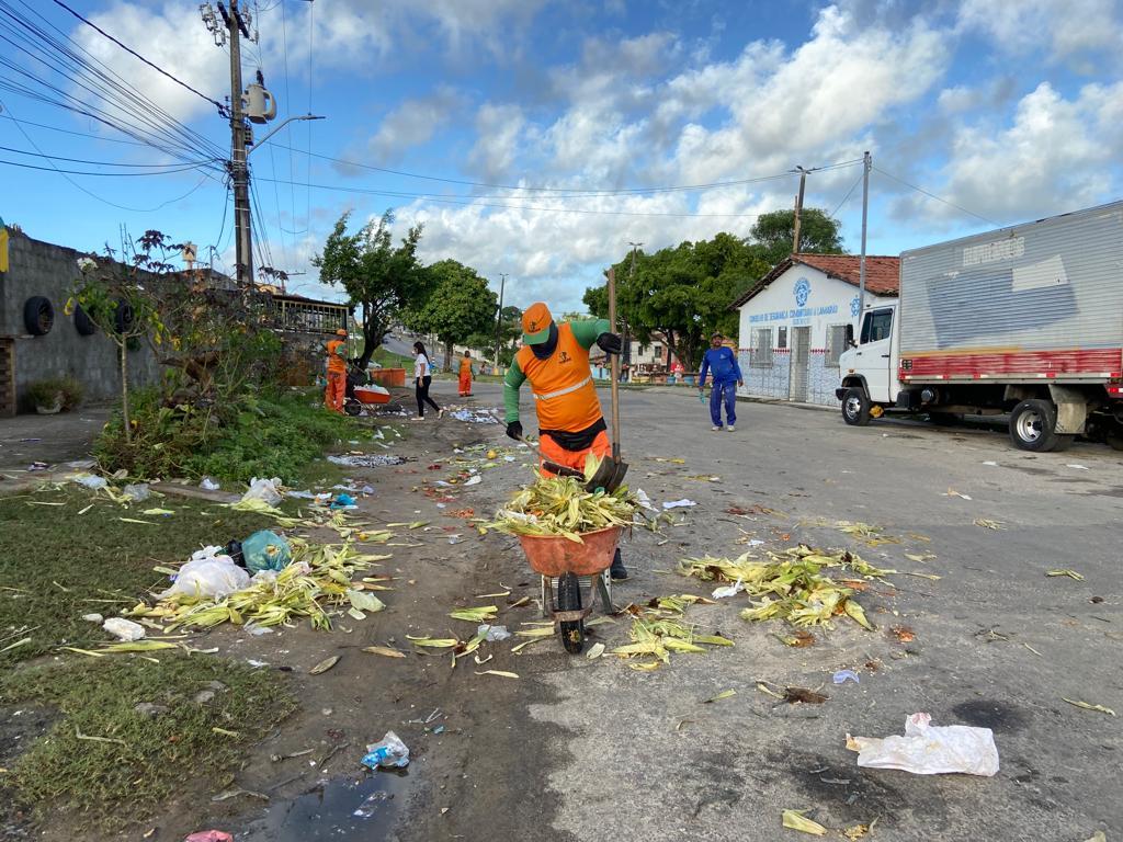 Paralelamente, as equipes da Emsurb também reforçaram a coleta de resíduos em pontos de vendas de milho, nos bairros São Conrado, Augusto Franco e Getúlio Vargas. A ação visa manter vias públicas limpas para os próximos dias de comercialização e muito arrasta-pé.