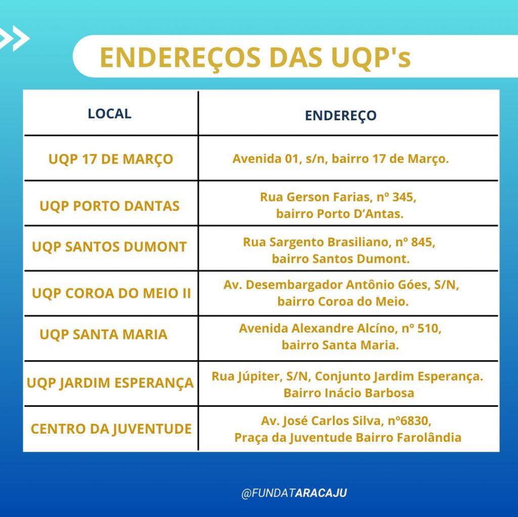 Os que já possuírem a certificação podem se inscrever normalmente nas turmas de seu interesse, em uma das nossas UQP’S ou nas cinco instituições parceiras onde serão realizadas as oficinas neste mês. Para se inscrever nos cursos presenciais, é necessário comparecer à sede da Fundat, localizada no calçadão da rua João Pessoa, 127, das 7h às 17h, ou em uma das unidades listadas abaixo, portando RG, CPF e comprovante de residência de Aracaju. Caso o participante seja menor de idade, se faz necessária também a presença dos pais ou responsáveis para efetuar a matrícula.