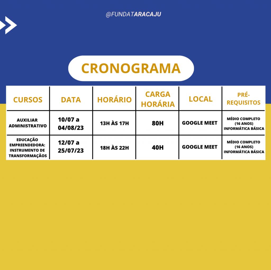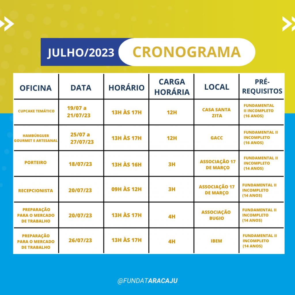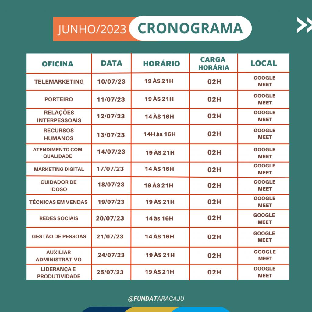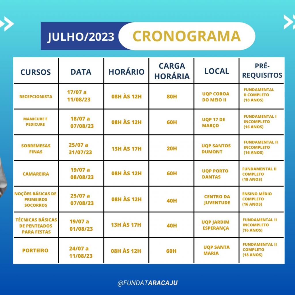 Podem participar todos os cidadãos residentes em Aracaju com idade igual ou superior aos 14 anos, que atendam os pré-requisitos exigidos em cada uma das modalidades de cursos disponibilizadas. Mas, neste mês, para participar dos cursos na modalidade presencial em uma das nossas sete Unidades de Qualificação Profissional (UQP’s), será necessário concluir primeiro a “Oficina de Qualificação para o Mercado de Trabalho”. Por isso, as inscrições serão divididas em duas etapas.