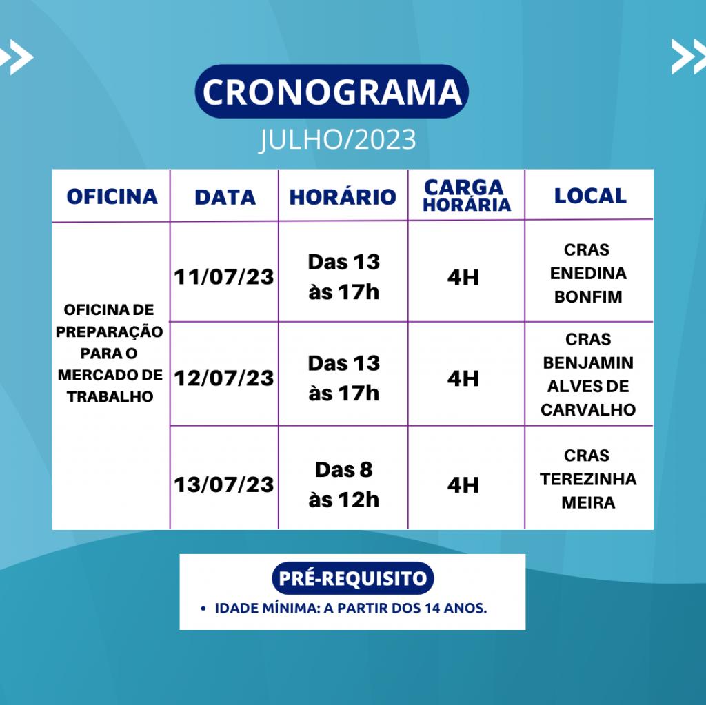 Em continuidade às ações de promoção da qualidade de vida e qualificação profissional, previstas nos objetivos do Auxílio Municipal Especial (AME), instituído pela Prefeitura de Aracaju, por meio da Secretaria da Assistência Social (Semfas), a Fundação Municipal de Formação para o Trabalho (Fundat) realizarán, neste mês de julho, a Oficina de Preparação para o Mercado de Trabalho em mais três Centros de Referência da Assistência Social (Cras).