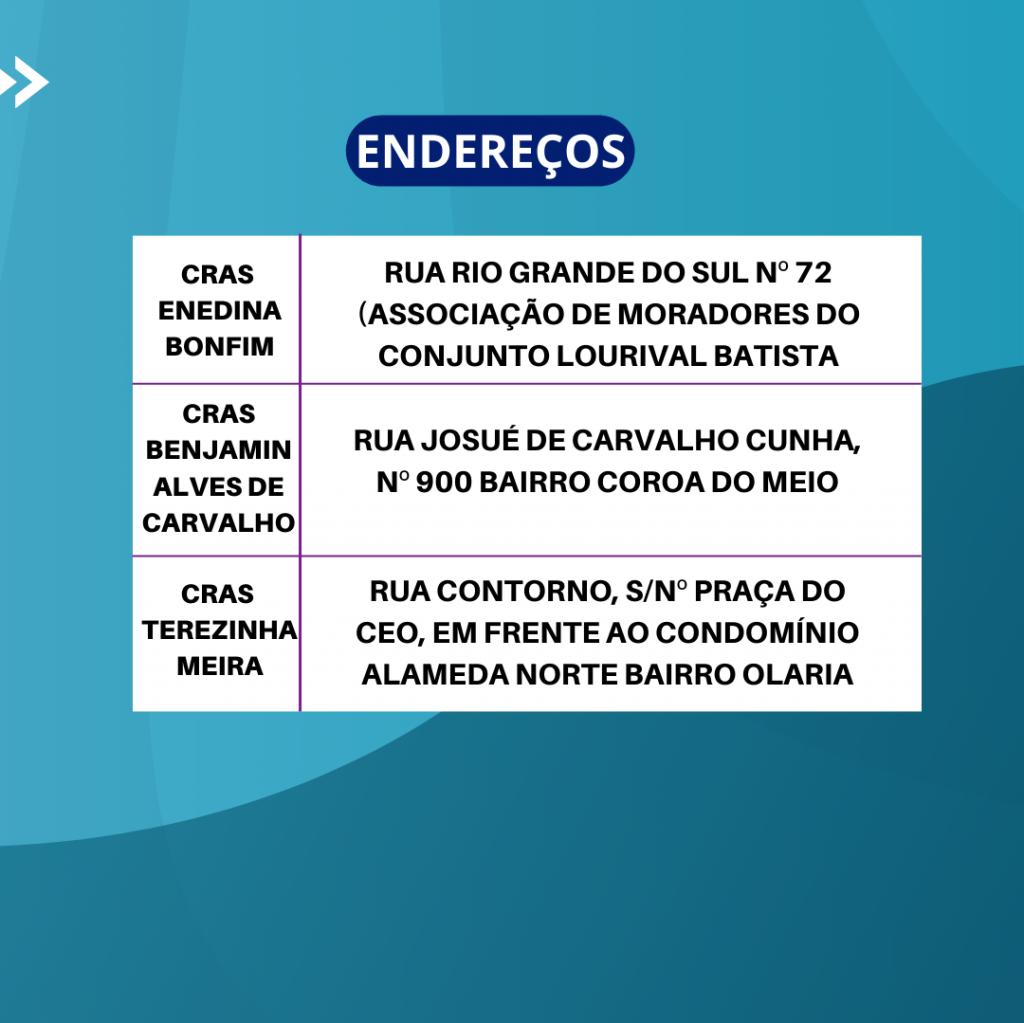 Desta vez serão contemplados os Cras Enedina Bonfim, no conjunto Lourival Batista; Benjamin Alves de Carvalho, no bairro Coroa do Meio; e Terezinha Meira, no bairro Olaria. O principal objetivo da qualificação é ampliar as oportunidades de inserção ou reinserção dos cidadãos no mercado de trabalho, através de encaminhamentos a instituições parceiras para que as famílias superem a situação de extrema pobreza.