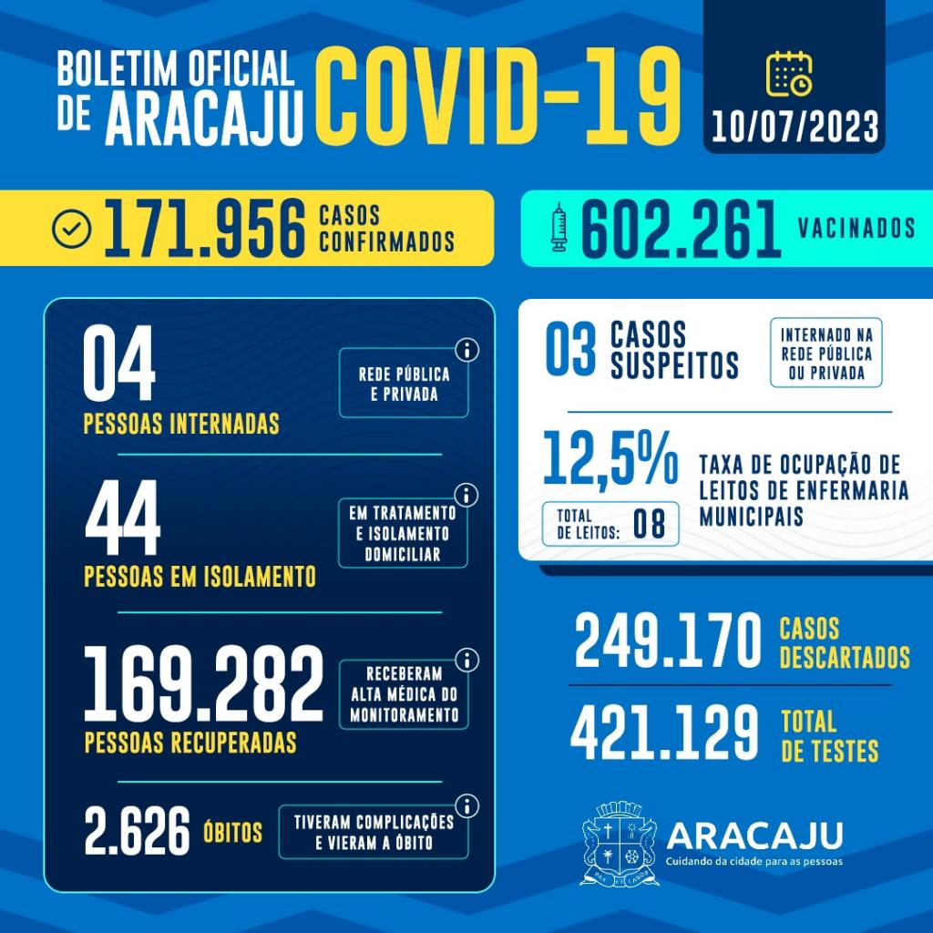 Com isso, 171.956 pessoas foram diagnosticadas com covid-19 em Aracaju. Destas, quatro estão internadas em hospital e 44 pacientes em isolamento domiciliar; 169.282 que estavam infectados já estão recuperados e 2.626 foram a óbito.