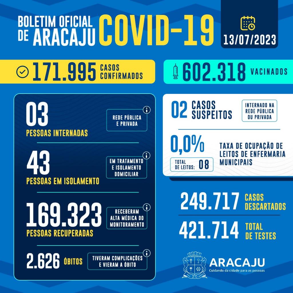 Com isso, 171.995 pessoas foram diagnosticadas com covid-19 em Aracaju. Destas, três estão internadas em hospital e 43 pacientes em isolamento domiciliar; 169.323 que estavam infectados já estão recuperados e 2.626 foram a óbito.