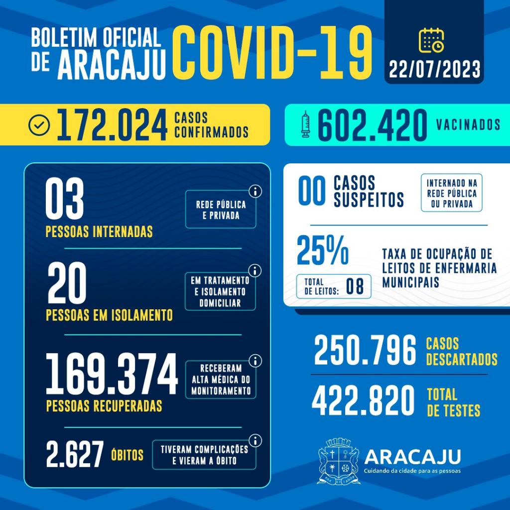 Com isso, 172.024 pessoas foram diagnosticadas com covid-19 em Aracaju. Destas, três estão internadas em hospital e 20 pacientes em isolamento domiciliar; 169.374 que estavam infectados já estão recuperados e 2.627 foram a óbito.