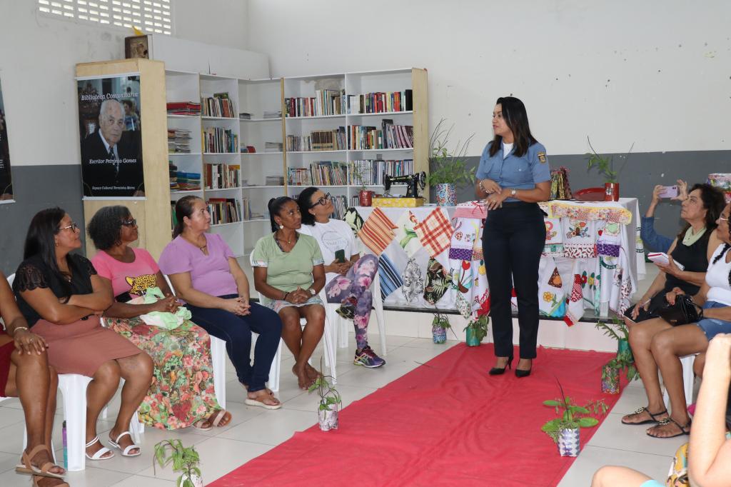 A guarda municipal da Patrulha Maria da Penha Sabrina Dias pôde conversar com as mulheres que estiveram presentes e orientar como agir em situações de violência.