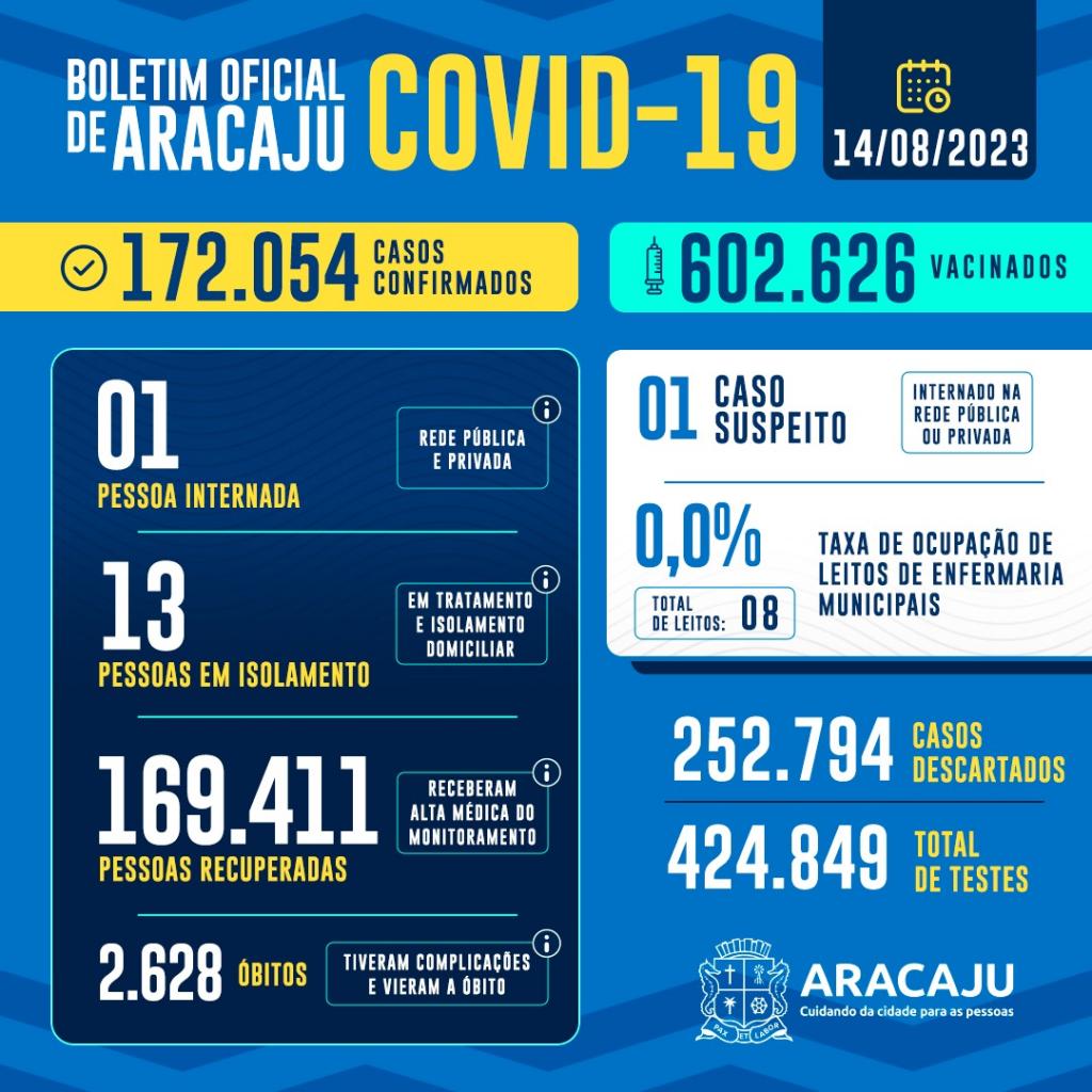 Com isso, 172.054 pessoas foram diagnosticadas com covid-19 em Aracaju. Destas, uma pessoa está internada e 13 pacientes estão em isolamento domiciliar; 169.411 que estavam infectados já estão recuperados e 2.629 foram a óbito.