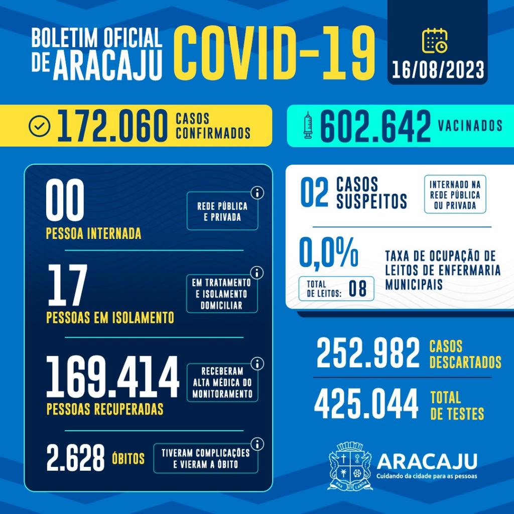 Com isso, 172.060 pessoas foram diagnosticadas com covid-19 em Aracaju. Destas, 17 estão em isolamento domiciliar; 169.414 que estavam infectados já estão recuperados e 2.629 foram a óbito.