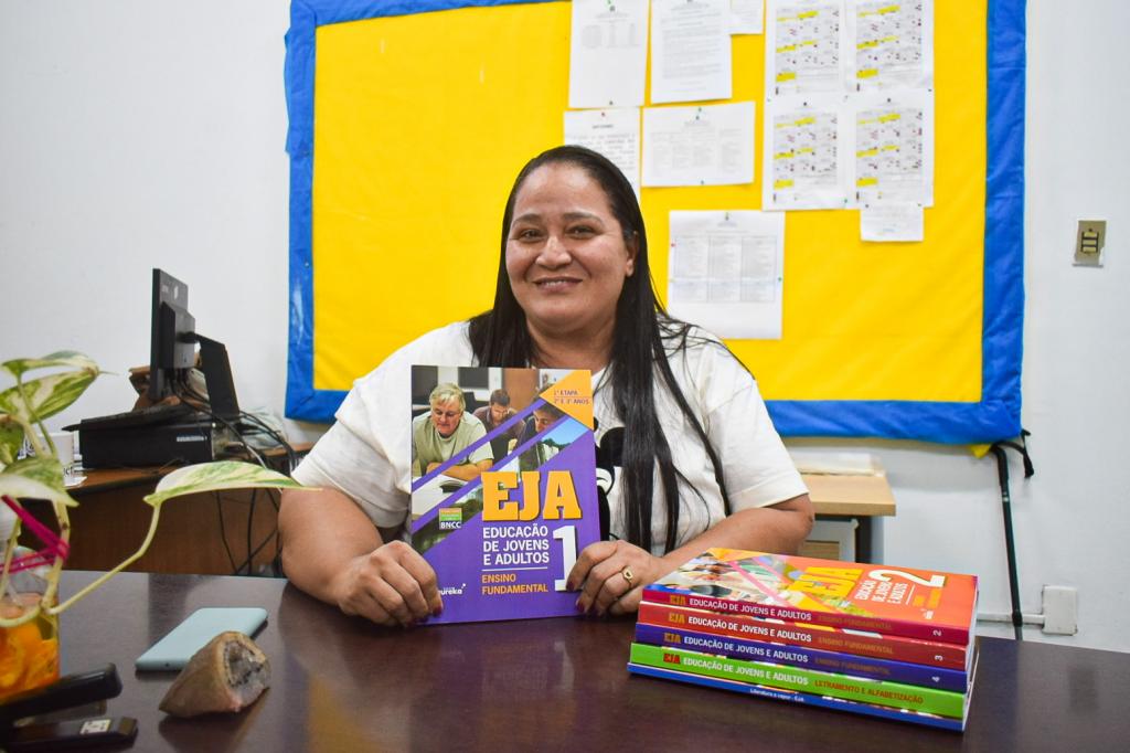 Satisfeita com a escolha dos materiais, a coordenadora da EJA, Sueli Bispo, explica o processo de definição dos livros e o diferencial dos conteúdos presentes. De acordo com ela, o material foi obtido pela Semed num processo muito particular.