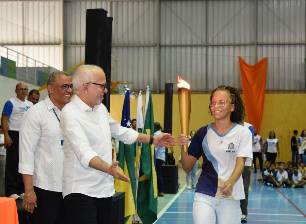 “Este é um momento de grande alegria para todos nós. Pedi, pessoalmente, ao secretário da Educação para que voltássemos a realizar esta importante competição, que movimenta a nossa rede de forma tão especial. A primeira edição dos Jogos Escolares aconteceu em 2019, mas infelizmente, em virtude da pandemia do novo coronavírus, precisamos suspender nos últimos anos. Hoje, ele está de volta, para estimular a prática esportiva pelos estudantes e para incentivá-los a desenvolver as suas habilidades. Fico muito feliz com a participação expressiva dos nossos estudantes neste evento que ajuda na formação e na disciplina.Tenho certeza de que eles farão bonito”, afirmou o prefeito após acender a pira olímpica acompanhado da estudante Alana Mikaela Fontes Santos, da Escola Municipal de Ensino Fundamental (Emef) Professor José Antônio da Costa Melo.