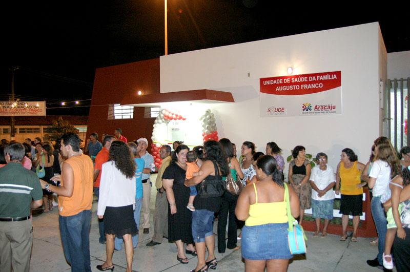 Foi inaugurada no início da noite de ontem, terça-feira, pelo prefeito Edvaldo Nogueira, a nova Unidade de Saúde da Família (USF) Augusto Franco. Localizada na praça do final de linha do conjunto Augusto Franco, a USF era uma necessidade da população do bairro, já que a antiga Uunidade funcionava em um prédio alugado pela Prefeitura. A nova Unidade, além de ter sido construída em terreno próprio, será a maior de toda a rede de saúde básica do município. "É um padrão muito extraordinário de USF. O conjunto Augusto Franco é um pólo aglutinador de uma região grande da cidade. Temos bairros acoplados ao Augusto Franco como a Farolândia, o Orlando Dantas e outros. Por isso tivemos que centrar aqui uma boa estrutura de saúde para atender toda essa população", comentou o prefeito Edvaldo Nogueira. Segundo a secretária municipal de saúde, Lêda Lúcia, a nova Unidade irá atender a um grande número de pessoas. "A equipe é formada por cerca de 70 profissionais, distribuídos em quatro equipes de saúde da família. Então, nós temos médicos, enfermeiros, auxiliares de enfermagem, assistentes sociais, dentistas, ou seja, é toda uma equipe para poder fazer a produção de saúde nessa Unidade. Esse posto tem capacidade de referência para atender 30 mil pessoas", informou Lêda Lúcia. Para o aposentado José Bispo dos Santos, a organização do sistema de saúde do município é o destaque. "Para nosso conjunto, essa é uma das obras mais importantes. Agora nós temos além do hospital zona sul, esse posto. Muito bem organizado e agora estamos bem abastecidos na área da saúde, e quero agradecer ao nosso prefeito por isso", disse. Já para o comerciante Neílton Oliveira Santos, a festa de inauguração do posto foi uma forma de divertir as pessoas do bairro. "Uma grande idéia do prefeito, a comunidade estava precisando de um posto dessa qualidade. E com essa festa bonita de inauguração cria uma forma de divertimento para a população aqui da comunidade", destacou. Batizada por Unidade de Saúde da Família Augusto Franco em homenagem ao ex-governador do Estado, a USF possui 622 metros quadrados de área construída, divididos em 19 consultórios, além de salas de nebulização, reunião, imunização e curativos, um amplo consultório odontológico com três gabinetes, uma recepção com capacidade para 60 pessoas sentadas e banheiro adaptado para deficientes físicos. A faixa inaugural foi descerrada pelo prefeito de Aracaju, pela secretária municipal de saúde e pela filha do ex-governador, Amélia Franco Guimarães, acompanhada de seu esposo Estácio Bahia Guimarães. Agradeço ao prefeito por esta homenagem em nome de toda a minha família. Agradeço principalmente por esta homenagem a Augusto Franco, que foi um homem que lutou pelas causa sociais, em benefício do povo de todo o Estado e da cidade de Aracaju, declarou Amélia. "Hoje também aproveitamos para homenagear o ex-governador Augusto Franco, pois foi um homem que fez muito por Sergipe e por Aracaju. E nada mais correto do que aproveitar o mês do aniversário da cidade para homenagem pessoas que contribuíram muito para o crescimento da cidade", falou o prefeito Edvaldo Nogueira. Estiveram presentes na solenidade os presidentes da Assembléia Legislativa, Ulices Andrade, e da Câmara de Vereadores de Aracaju, Sérgio Góes; a secretária adjunta de Estado da Saúde, Mônica Sampaio; o vereador João Francisco dos Santos (Chico Buchinho); além de secretários municipais. Após a inauguração houve show da banda Forte Desejo.