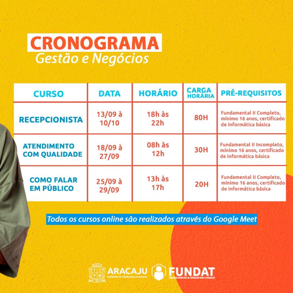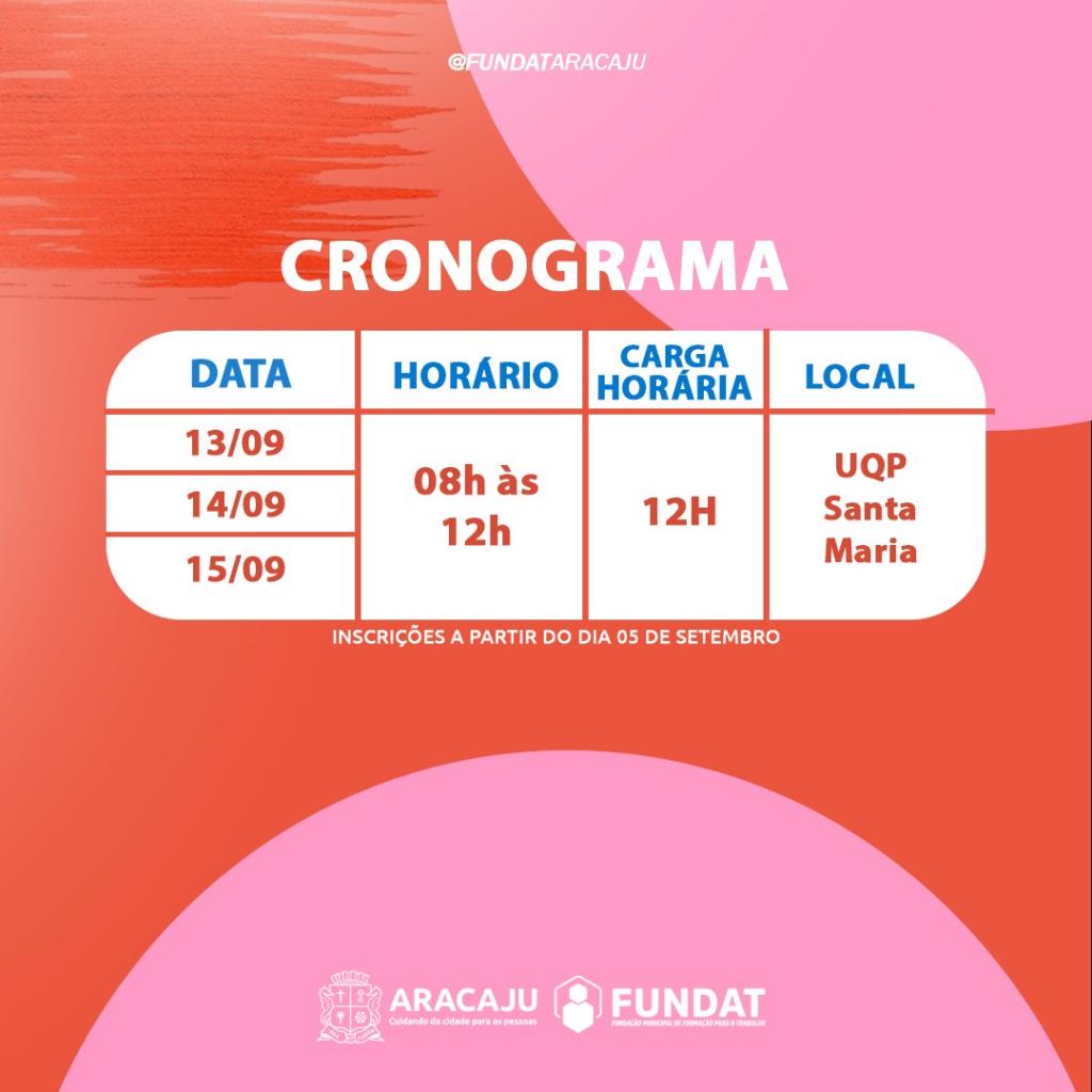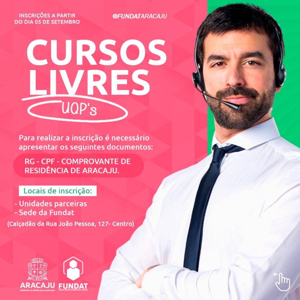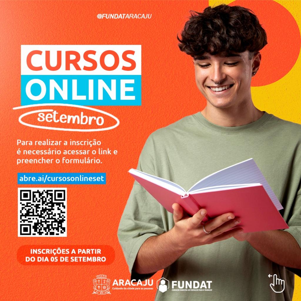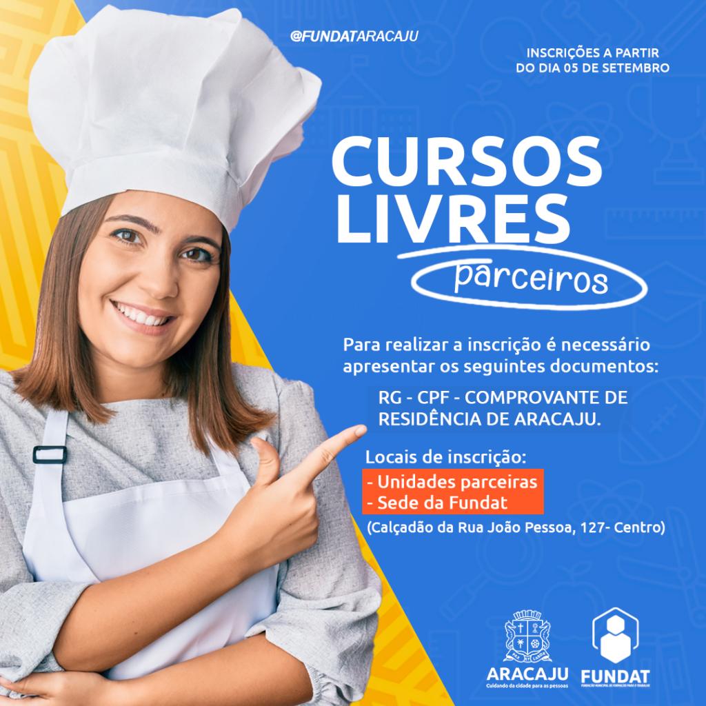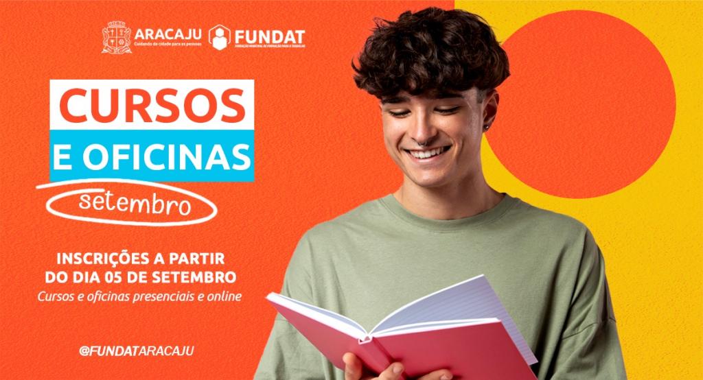 A partir da próxima terça-feira,  dia 5, a Prefeitura de Aracaju abre as inscrições para 3.150 vagas em cursos e oficinas de qualificação da Fundação Municipal de Formação para o Trabalho (Fundat), distribuídas em 45 turmas presenciais e online, cuja aulas serão realizadas no mês de setembro. Os cursos são ofertados para os cidadãos com idade a partir dos 14 anos, residentes em Aracaju e que atendam os pré-requisitos exigidos em cada uma das modalidades de cursos disponibilizados.