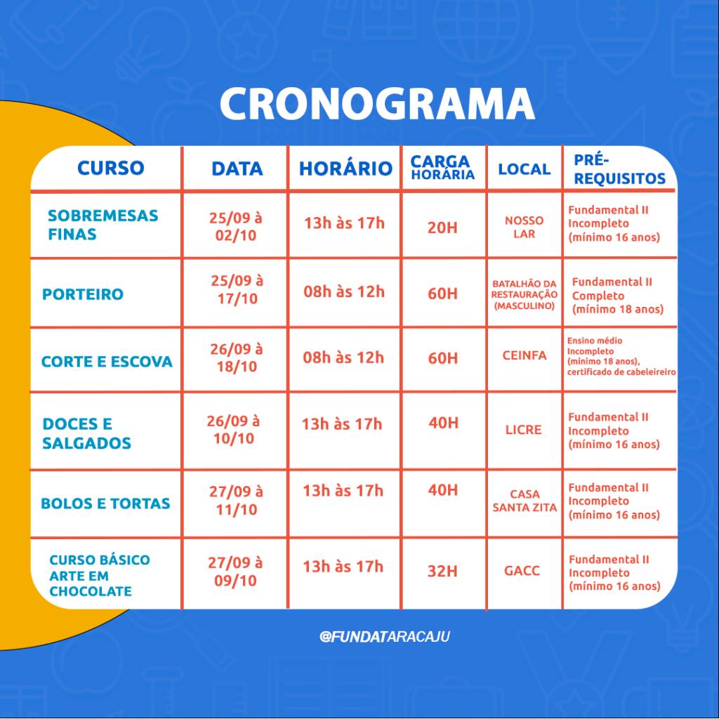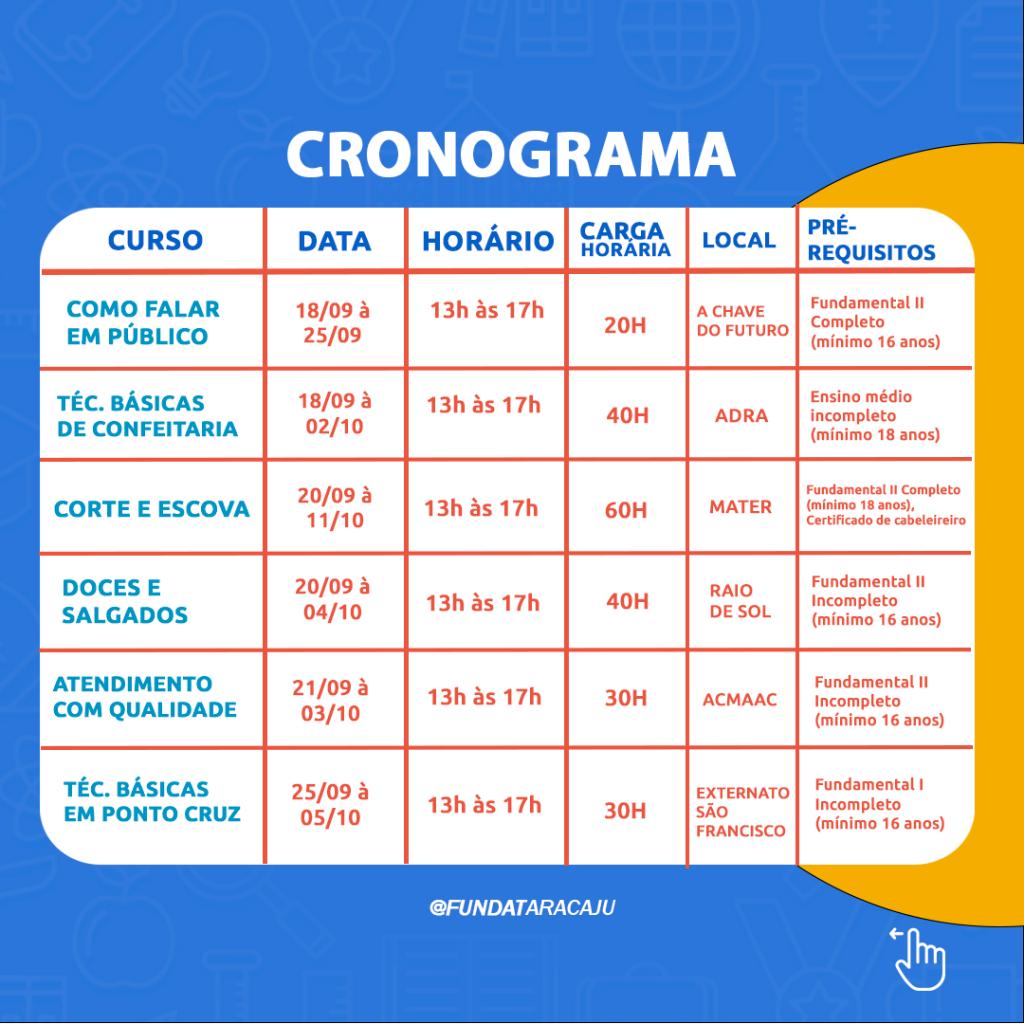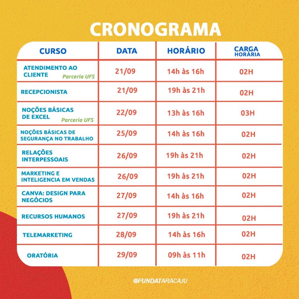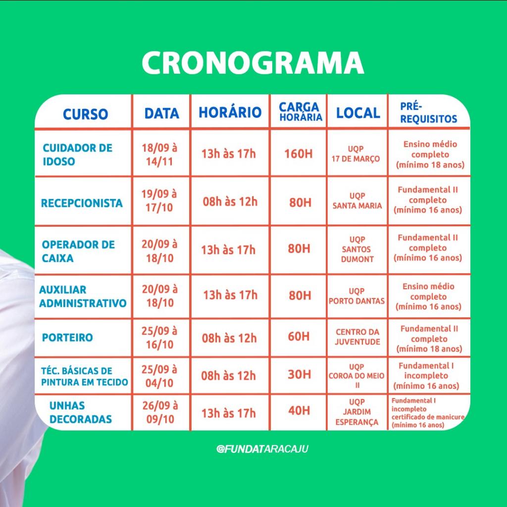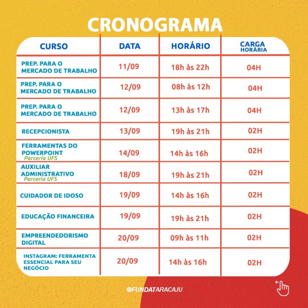 A partir da próxima terça-feira,  dia 5, a Prefeitura de Aracaju abre as inscrições para 3.150 vagas em cursos e oficinas de qualificação da Fundação Municipal de Formação para o Trabalho (Fundat), distribuídas em 45 turmas presenciais e online, cuja aulas serão realizadas no mês de setembro. Os cursos são ofertados para os cidadãos com idade a partir dos 14 anos, residentes em Aracaju e que atendam os pré-requisitos exigidos em cada uma das modalidades de cursos disponibilizados.