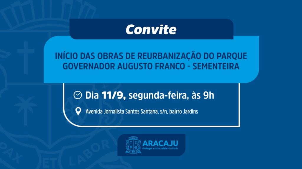 A Prefeitura de Aracaju convida a imprensa para o início das obras de reurbanização do Parque Governador Augusto Franco - Sementeira, na próxima segunda-feira, dia 11, às 9h, no bairro Jardins.