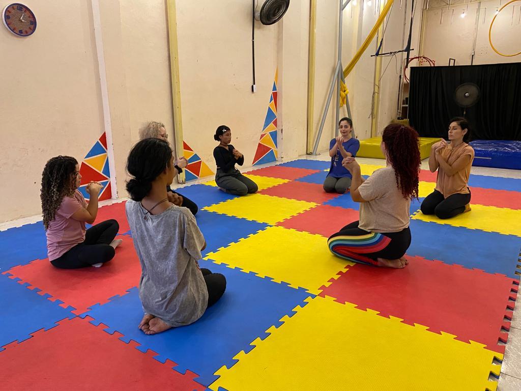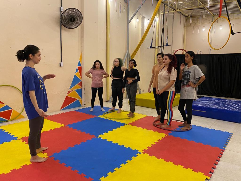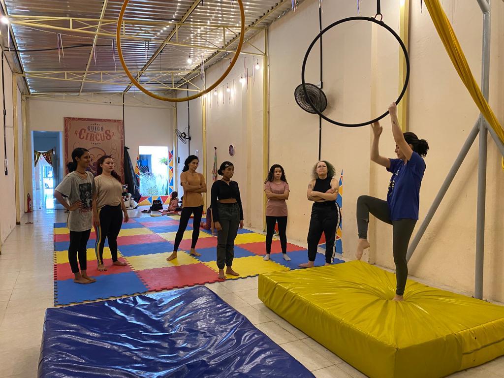A oficineira explica que na turma de Acrobacias Aéreas Bases 1 as aulas são focadas em exercícios de fortalecimento e alongamento, trabalhando a consciência corporal dos alunos para que eles depois possam aprender a manusear os aparelhos. Além do desenvolvimento de pequenas sequências de movimentos – subidas e descidas nos aparelhos –, ainda de maneira mais inicial.