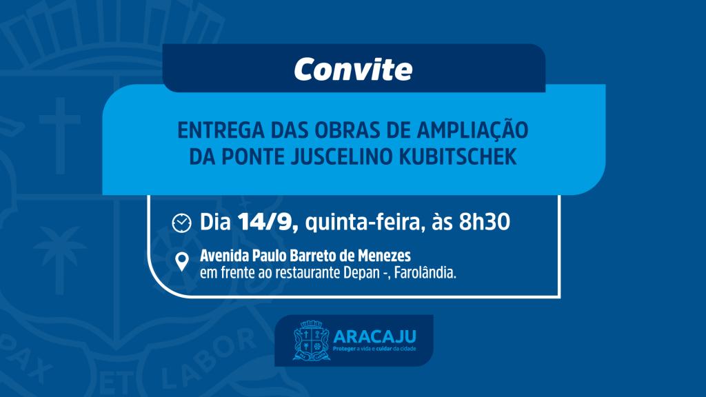 A Prefeitura de Aracaju convida a imprensa para a solenidade de entrega das obras de ampliação da ponte Juscelino Kubitschek - sobre o rio Poxim -, nesta quinta-feira, dia 14, no bairro Farolândia.