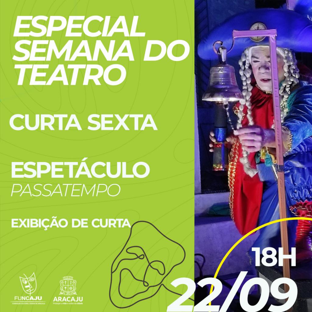 A programação do Especial Semana do teatro será concluída com o Curta Sexta, no dia 22, às 16h, com a apresentação do espetáculo “Passatempo” e outras peças apresentadas no Festival de Artes Cênicas de Aracaju, como parte das entregas da Lei Aldir Blanc. O Curta Sexta é realizado no Cine Vitória, na Rua do Turista, no Centro. Entre as performances a serem exibidas, estão: “O Baile do Cheiroso”, do grupo Mamulengo de Cheiroso; e “Remundados”, do Boca de Cena.