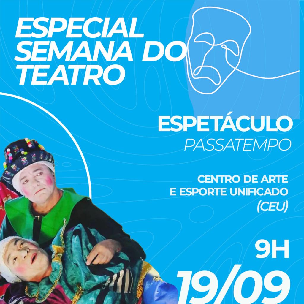 A programação será aberta na próxima terça-feira, 19 de setembro, Dia Nacional do Teatro, com o espetáculo Passatempo, às 9h, no Centro de Arte e Esportes Unificado (CEU), no bairro 17 de Março. Além de estar aberto ao público em geral, alunos da rede municipal de Aracaju poderão se divertir com a sessão teatral.