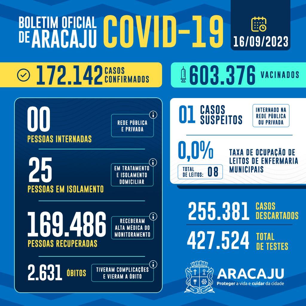 Com isso, 172.142 pessoas foram diagnosticadas com covid-19 em Aracaju. Uma pessoa internada, 25 estão em isolamento domiciliar; 169.486 que estavam infectados já estão recuperados e 2.631 foram a óbito.