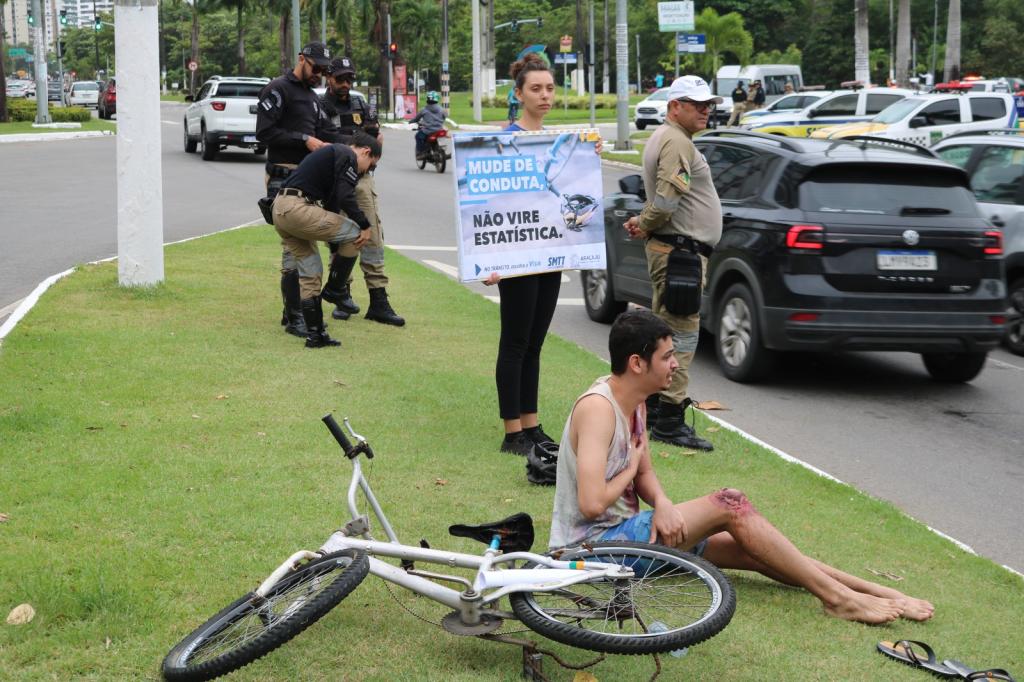 Durante a ação, as equipes entregaram material informativo sobre segurança no trânsito para quem passava pela região e atores do grupo de teatro Cones, da Coordenadoria de Educação para o Trânsito (CET) da SMTT Aracaju, encenaram um sinistro de trânsito, envolvendo um ciclista.