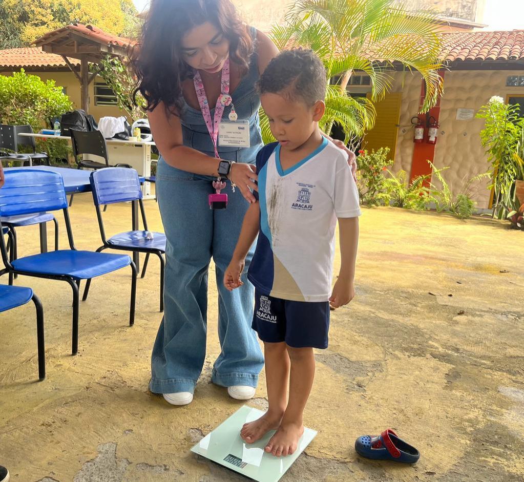 A Prefeitura de Aracaju, por meio das Secretarias Municipais da Saúde (SMS) e da Educação (Semed), realiza o Programa Saúde na Escola (PSE), que leva às instituições de ensino ações de promoção, prevenção e atenção à saúde. Nesta quinta-feira, 21, em parceria com a Universidade Tiradentes (Unit), o PSE realizou avaliação antropométrica de alunos da Escola Municipal de Educação Infantil (Emei) Nunes Mendonça, no bairro Coroa do Meio, em parceria com .