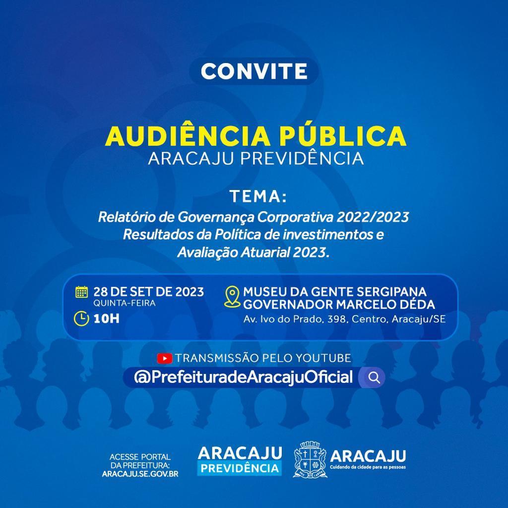 O Instituto de Previdência do Município de Aracaju (Aracaju Previdência) realizará a primeira audiência pública de Gestão do Regime Próprio de Previdência Social. A audiência será nesta quinta-feira, 28, a partir das 10h, no auditório do Museu da Gente Sergipana Governador Marcelo Déda.