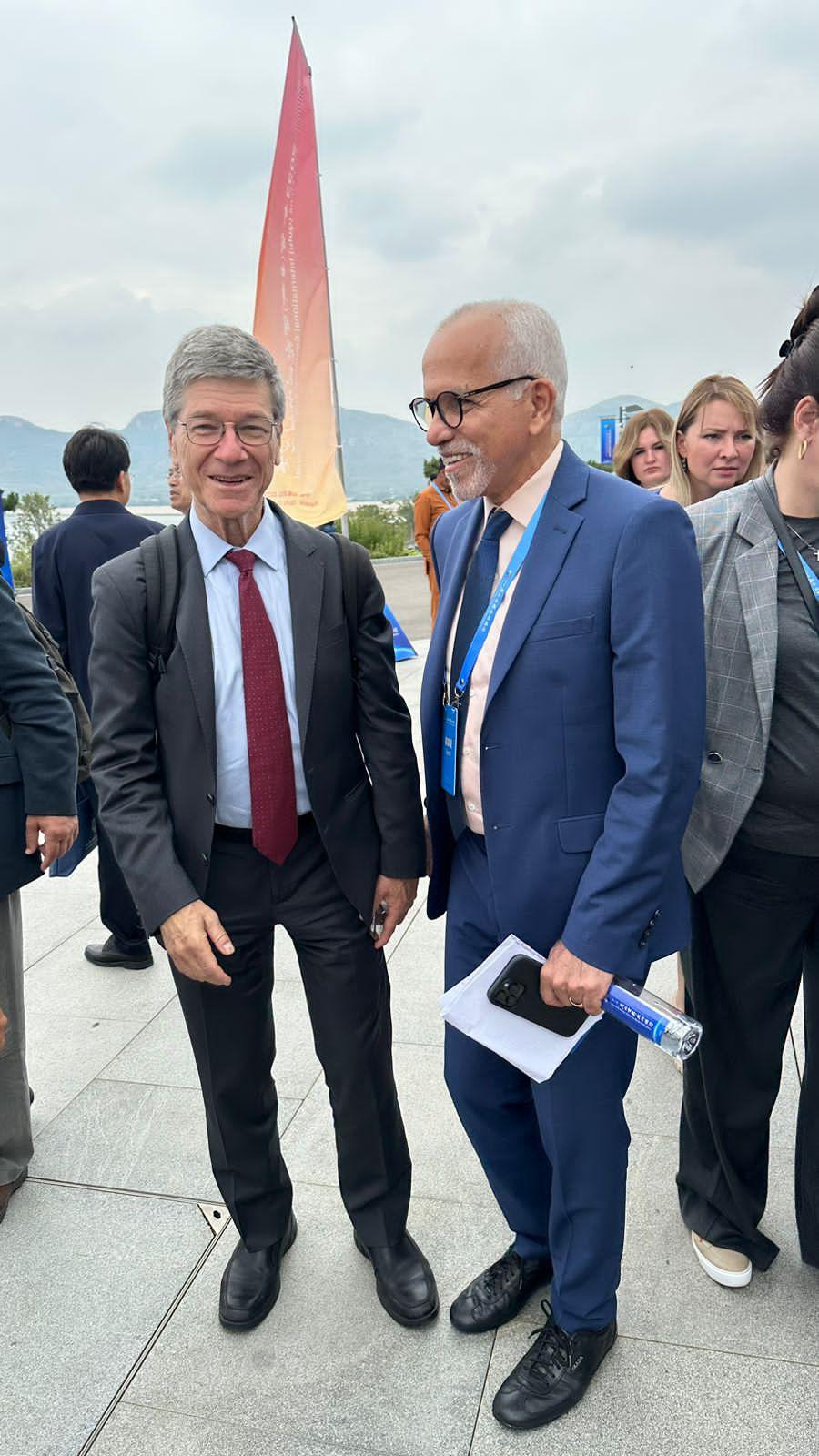 Após os discursos iniciais, o evento contou com uma palestra do presidente do departamento de Soluções Sustentáveis da Organização das Nações Unidas (ONU) e economista da Universidade de Columbia, Jeffrey Sachs. "Ele é uma figura extremamente renomada, respeitada no mundo inteiro. É um dos maiores economistas americanos, foi professor em Harvard e, agora, leciona na Universidade de Columbia. Portanto, foi uma palestra maravilhosa, enriquecedora e que mostra a importância deste fórum mundial. Ao final da sua palestra, tive a oportunidade de cumprimentá-lo e de conversar com ele. Foi uma grande felicidade estar lado a lado com Jeffrey Sachs neste grande evento", afirmou Edvaldo.