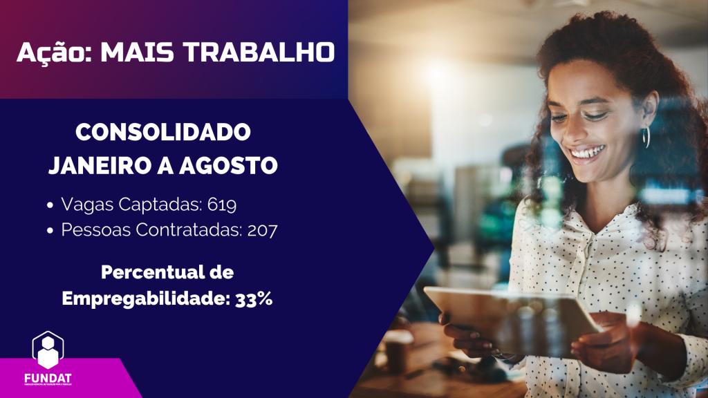 A Fundação Municipal de Formação para o Trabalho (Fundat) segue avançando na oferta de qualificação profissional e encaminhamento de jovens para o mercado de trabalho. Somente este ano, entre os meses de janeiro a agosto, a Fundat ofertou 15.050 vagas em cursos e oficinas, das quais 7.353 foram preenchidas por jovens de 15 a 29 anos, gerando uma aprovação de 5.353, o que representa 75% dos participantes.