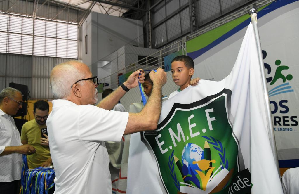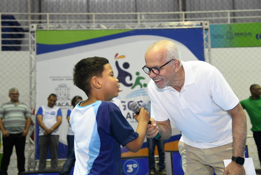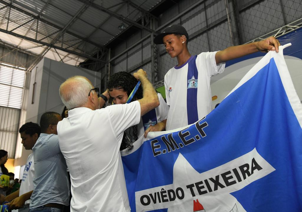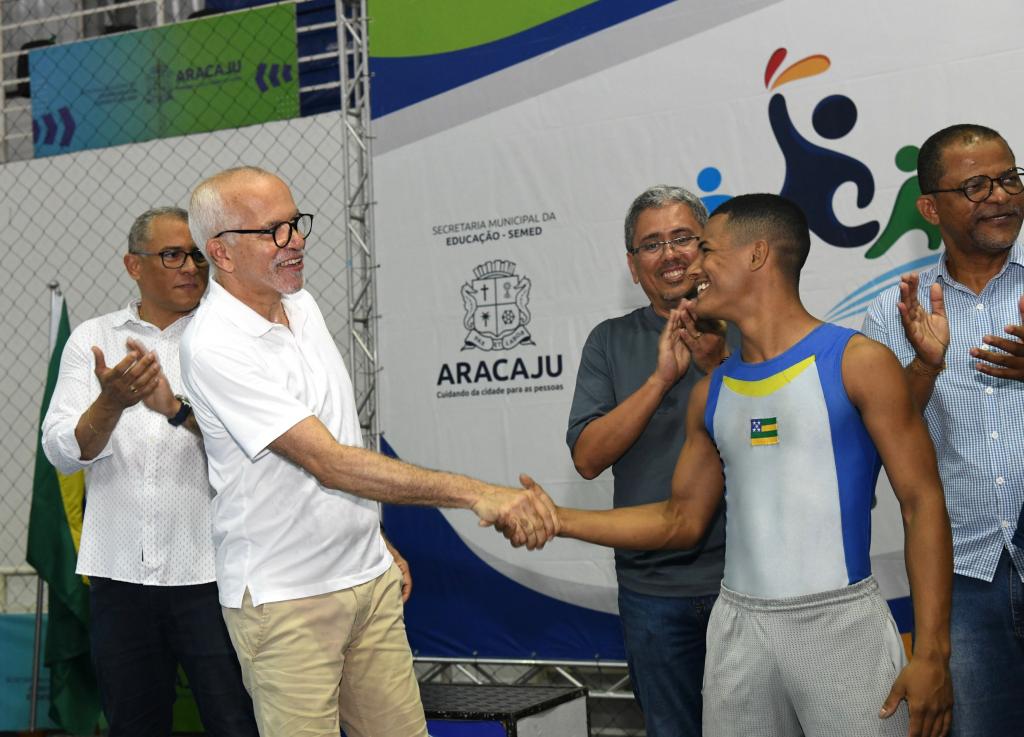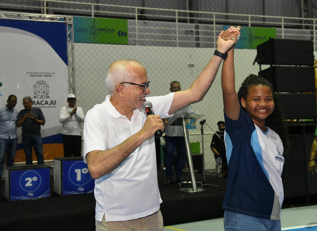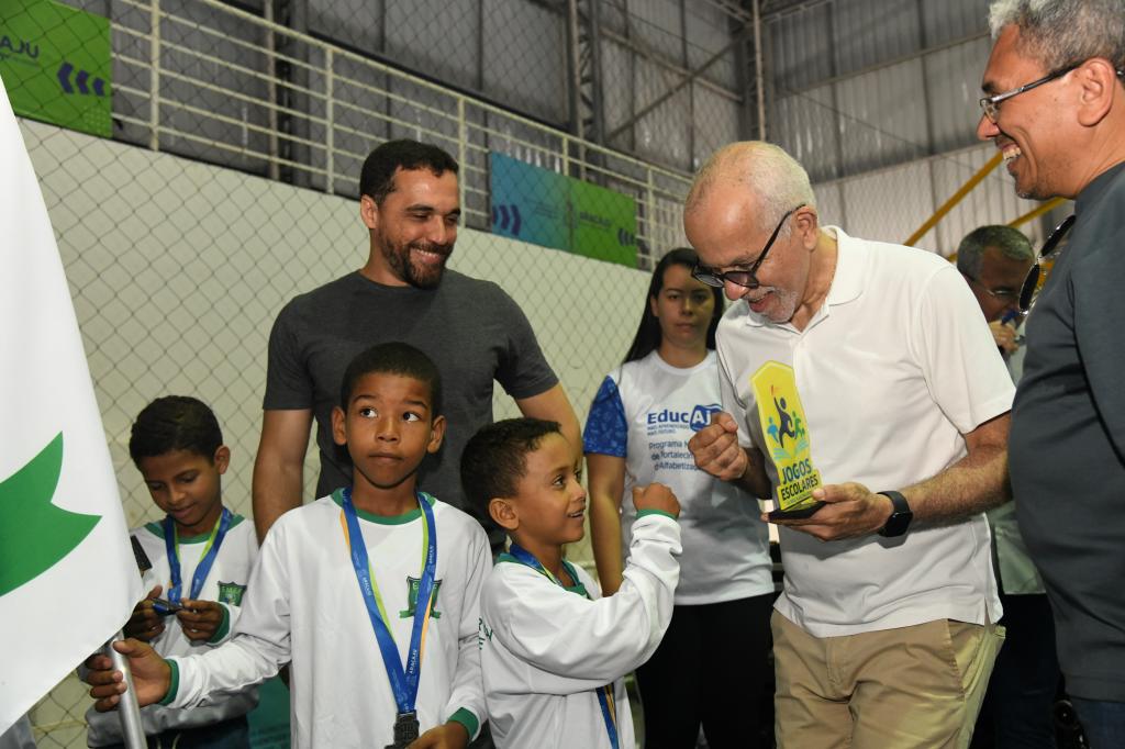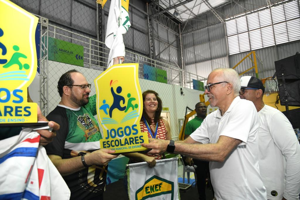 O prefeito Edvaldo Nogueira realizou, neste sábado, 7, a entrega da premiação dos Jogos Escolares Municipais. Ocorrida no Estação Cidadania-Esporte Jornalista Carlos Magno, no bairro Bugio, a cerimônia reuniu 760 alunos da rede pública de ensino de Aracaju que alcançaram as primeiras colocações dos pódios nas 14 modalidades esportivas da competição. Ao todo, três mil estudantes de 36 escolas municipais se inscreveram na segunda edição dos jogos. Além dos estudantes, as equipes de educação física e professores das unidades de ensino da capital também participaram da programação de encerramento.