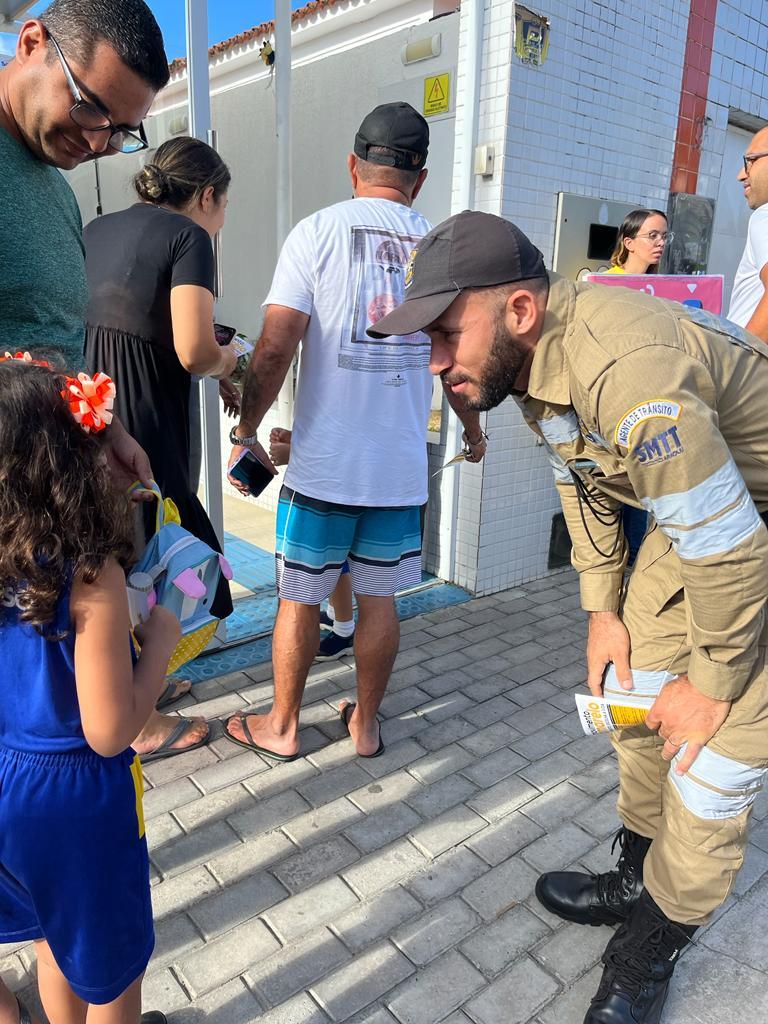No local, agentes e a equipe da Coordenadoria de Educação para o Trânsito (CET) da SMTT, sensibilizaram pais, responsáveis e alunos, fazendo a distribuição de material educativo e reforçando as boas condutas que devem ser adotadas no trânsito, que são essenciais para evitar sinistros.